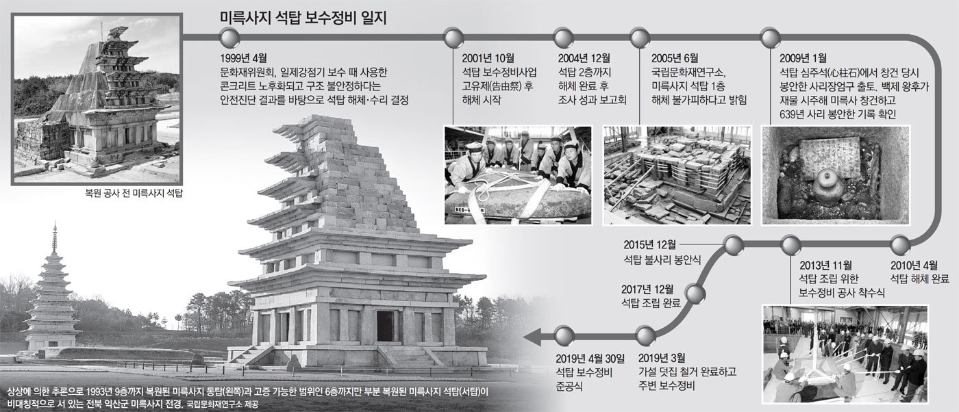 멸망해가는 백제의 중흥을 꾀한 서동요의 주인공, 무왕이 지었다 하는 미륵사는, 신라 황룡사(皇龍寺)의 목탑중심체제에다가 양옆에 목탑의 복제양식인 석탑을 세움으로써 스투파 개념의 획기적 전기를 마련하였다. 그 3탑3원체제는 『삼국유사』의 기사가 말해주는 대로 용화3회(龍華三會)라는 미륵하생신앙을 구체적으로 형상화한 것이 틀림이 없지만, 결과적으로 중앙 1목탑의 의제(擬製)로서의 쌍석탑의 출현은 이미 탑의 의미가 건축배치상의 조형적 요소로서 해석되는 소지를 갖게되어 순수 디자인 개념으로 발전할 수 있는 새로운 석탑의 장을 연 것이다. 석탑은 소실의 염려가 없으며 장구한 세월을 버틸 수 있다. 그리고 소재의 성격상 목탑보다는 소형화될 수 밖에 없다.