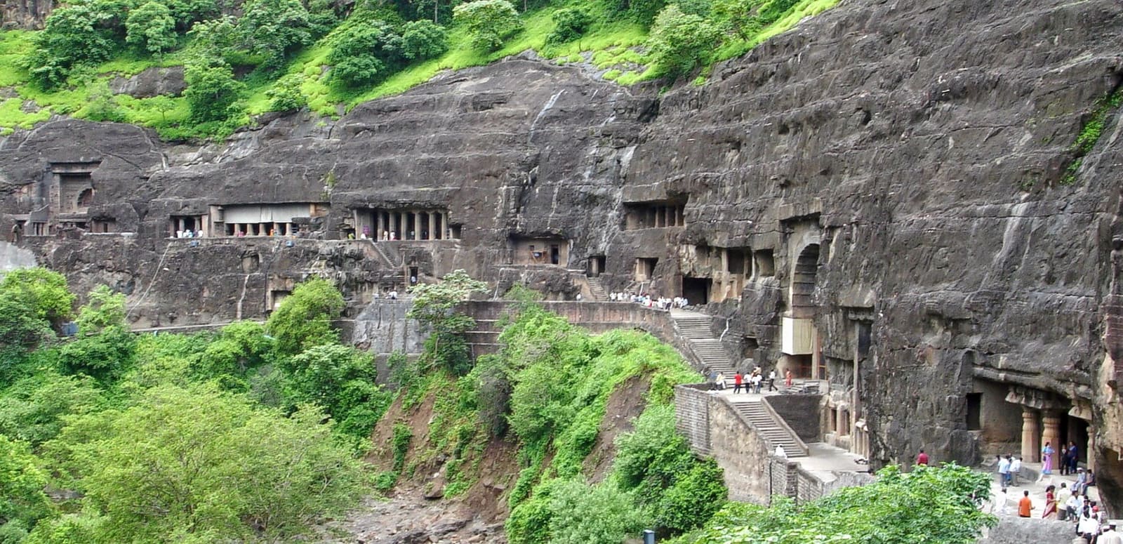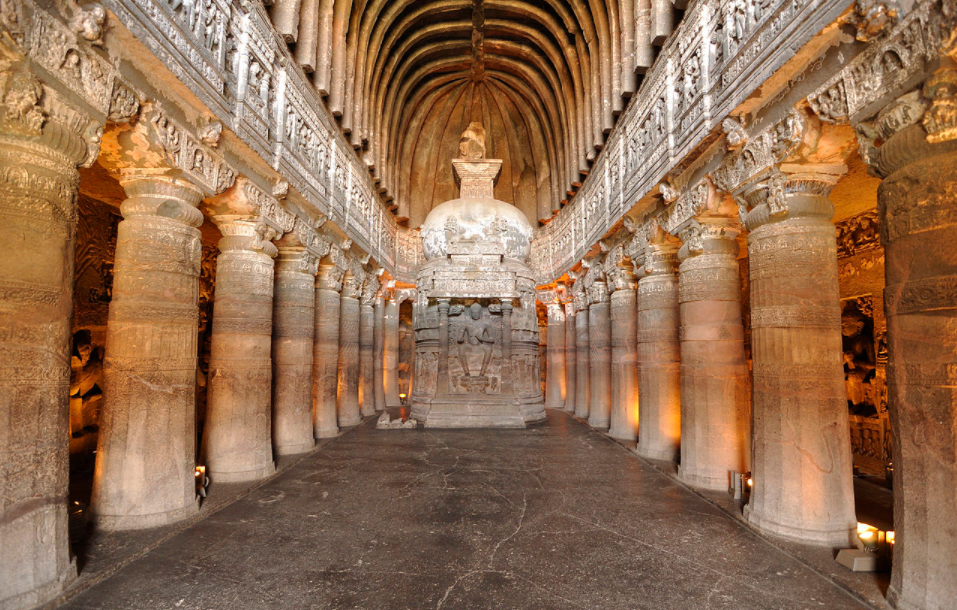 ▲ 아잔타의 차이띠야. 19번 석굴, 통돌을 파들어간 것이지만 그 구조는 목재 돔 형식을 반영하고 있다. 그러니까 정말 초기 차이띠야는 목재의 공포형식으로 지은 것임을 알 수 있다. 홀의 끝에 스투파가 있다. 그리고 스투파(stūpa)에 또 불상이 조각되어 있다. 이 불상조각으로 미루어 이 차이띠야는 대승시대에 조성된 것이 분명하다. 19번 석굴 차이띠야의 17개의 석주에 새겨진 정교한 조각. 부처의 화려한 생애와 득도의 고행(苦行)이 감실과 주변에 묘사되어 있다. AD 500~550년 경으로 추정.