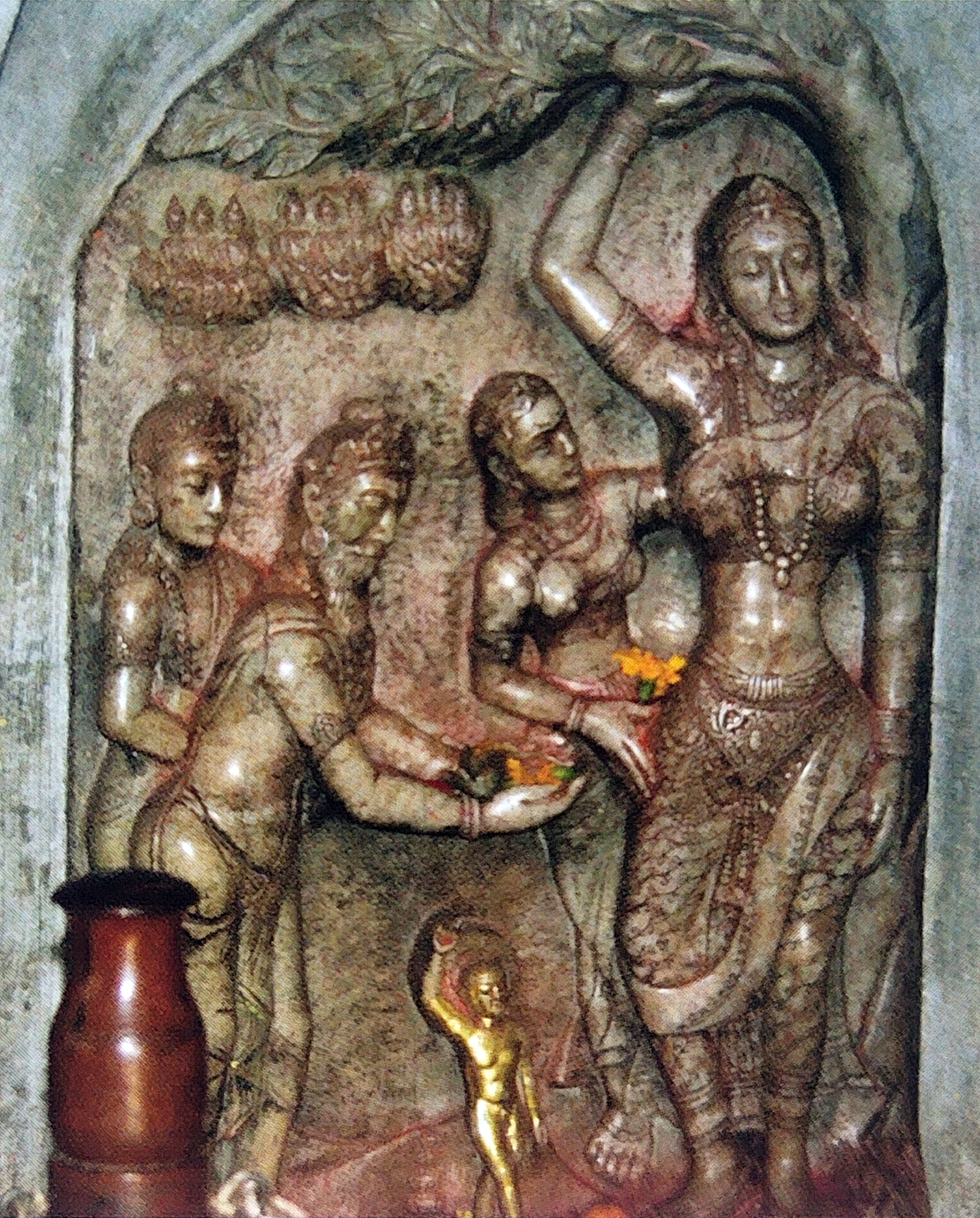 ▲ 룸비니에 새겨진 마야부인의 출산상. 마야부인이 무우수 가지를 휘어잡고 있고 겨드랑이에서 떨어진 금빛의 아기가 보인다.