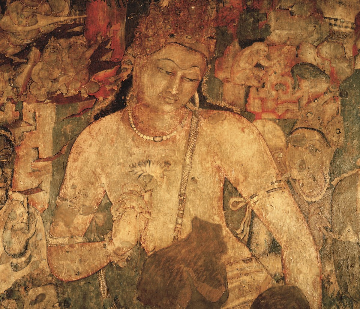 제10번 석굴의 기둥에 새겨진 보살들의 모습, 아잔타의 벽화는 대체로 자타카, 그러니까 싯달타 전생의 보살들의 이야기를 주제로 하고 있다. 때로는 동물로도 등장. 옆 페이지는 제1석굴의 유명한 연화수보살(蓮花手菩薩 Bodhisattva Padmapani)의 모습. 오른쪽 어깨위로는 원숭이가 장난치고 있고, 그 위로는 공작새와 여인의 모습이 보인다. 왼쪽 어깨위로는 천상의 악사 킨나라(kinnara)가 기타를 치고 있다. 천상ㆍ천하의 모든 유혹 속에서 고요하게 진리에만 몰두하는 보살의 모습을 그리고 있다.
