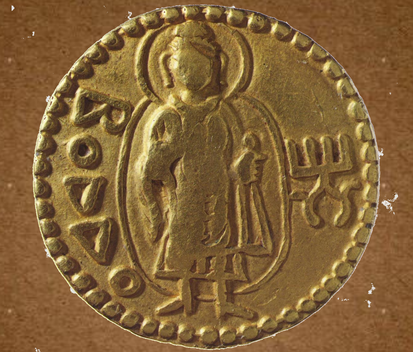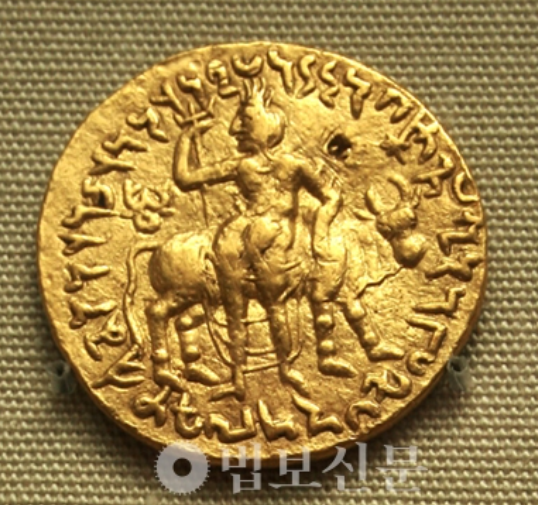 ▲ 제2의 아쇼카라 할 카니쉬카 왕이 로마의 아우구스투스 주화를 모방하여 주조한 이 금화들은(AD 1ㆍ2세기) 쿠샨왕조의 종교와 문화에 대한 위대한 선전물이라 할 수 있다. 변형된 그리스 문자가 분명히 ‘붓다’임을 명시하고 있다. 광배와 긴 귓밥, 휘감은 법복의 주름형태들이 이미 오늘날 불상의 조형적 요소를 다 포함하고 있다. 그리고 난디를 타고 있는 시바의 주화도 발견된다. 쿠샨 왕조의 국제적 성격과 다양한 종교에 대한 관용성을 잘 전해주고 있다. 대영박물관 소장.