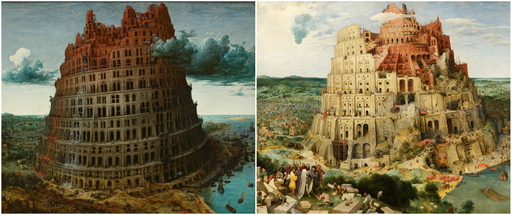 이 그림은 브뤼겔(Bruegel)이 「이카루스의 추락」이라는 동명의 그림을 위해 그려 보았던 판화인데, 약간 아래에 날개를 달고 있는 사람이 이카루스의 아버지 다이달로스다. 이카루스는 태양에 더 가까이 올라가 있는데, 이미 날개를 붙인 밀납이 녹이 몸이 균형을 잃은 탓에 막 추락하려 하는 순간이다. 그런데 우연일까? 이카루스를 그린 브뤼겔은 바벨탑을 건축하는 장면을 최소한 세 번을 그렸고, 그 중 둘은 유명한 그림으로 남아 있다. 브뤼겔 자신이 하늘을 향해 올라가고 싶었던 것일까?