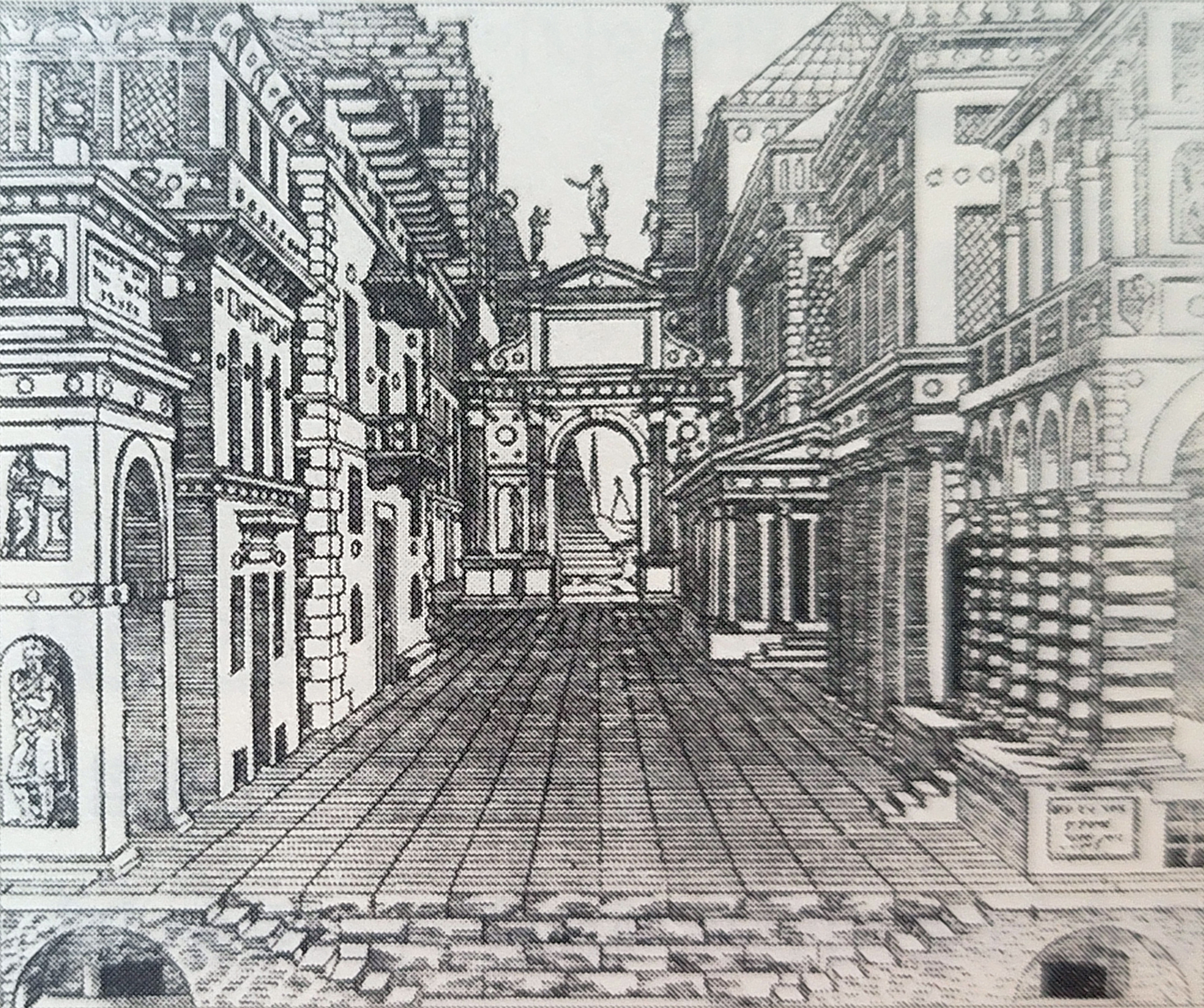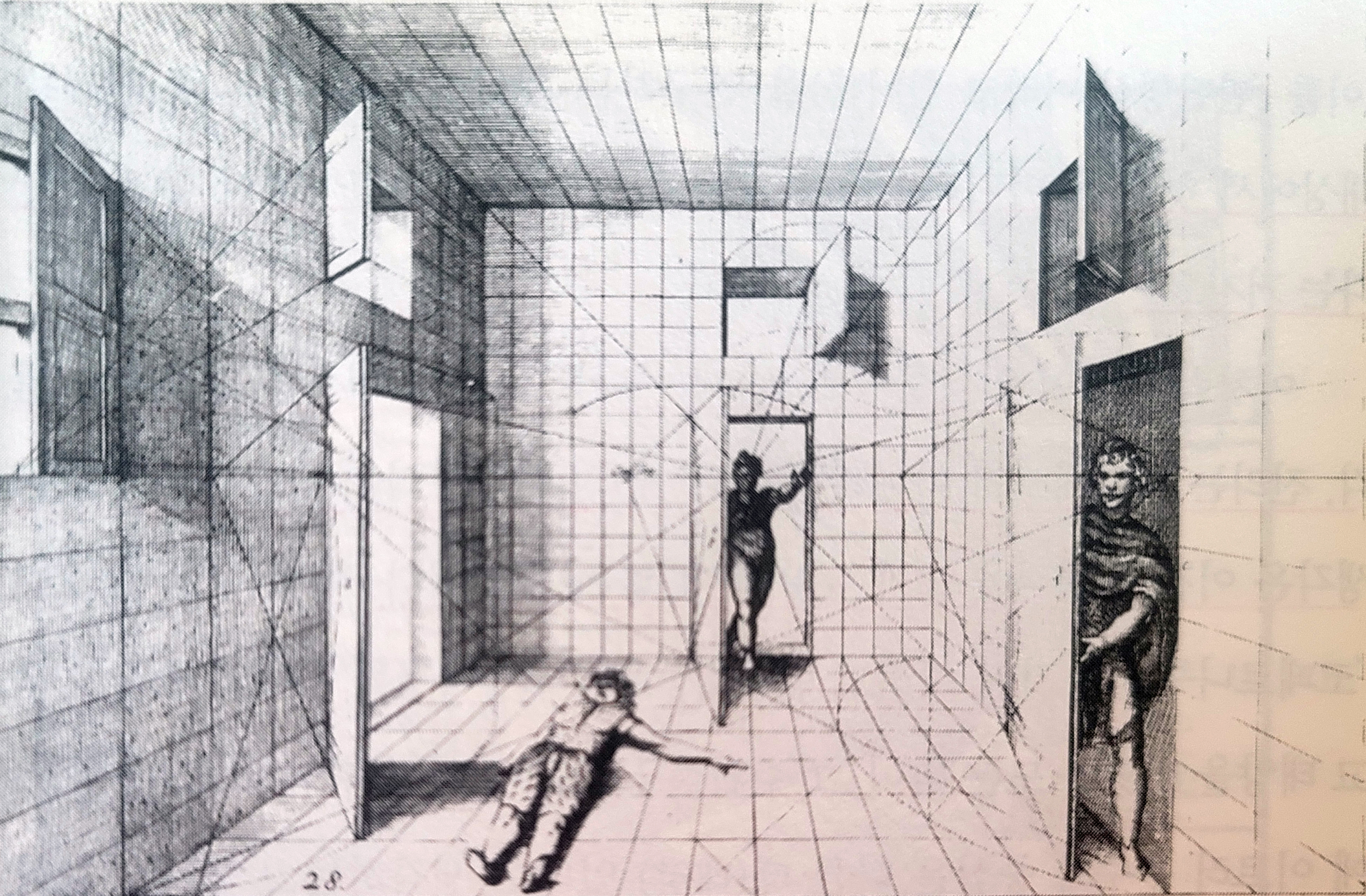 위의 그림은 1560년 경에 출판된 투시법에 관한 책에 있는 삽화다. “격자는 화가의 눈에 있는 게 아니라 세계 자체에 속해 있다”고 말하려는 것일까? 바닥과 천장, 사면의 벽이 모두 격자로 가득하다. 열린 문이나 창문의 비스듬한 평행선들은 각각 자신의 소실점에 모인다. 사람들은 이 격자로 가득한 공간 안에 있거나 그 안으로 들어온다. 정면에서 손을 번쩍 들고 들어오는 사람의 오른쪽 눈은 방 안의 평행선들이 모이는 소실점에 위치해 있으며, 그래서 격자를 만드는 선이 모이고 있지만, 이를 눈에서 격자를 만드는 선이 나오는 것으로 오해해선 곤란하다. 정면에 있는 인물의 시선에선 아무런 그물도 발사되지 않고 있을 뿐 아니라, 정면 인물의 눈에 닿는 선은 최소한으로 처리됨으로써 오히려 그는 그물 같은 저 격자의 공간 안에 사로잡혀 있음을, 그가 보는 것은 그 격자화된 공간 안에 있음을 보여준다. 아래 그림은 세를리오(Sebastiano Serlio)의 「비극을 위한 무대」(Scene for a tragedy)다. 세를리오는 좀더 세련된 스타일로 이런 격자화된 공간을 ‘객관화’한다. 그가 그린 「희극을 위한 무대」, 「비극을 위한 무대」에는 투시법에 따라 변형된 격자가 바닥의 바둑판 같은 포장도로, 건물의 벽, 기둥 등에 촘촘하게 새겨져 있다.