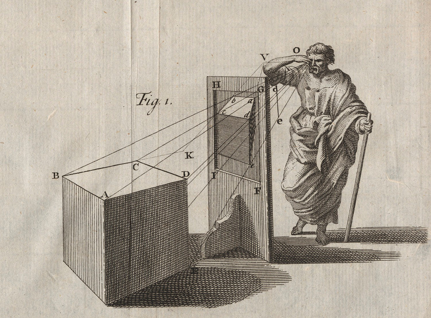 3차원의 세계를 2차원의 평면에 정확히 재현하는 방법을 ‘투시법’ (perspective)이라고 부른다. 1425년 피렌체의 브루넬레스키가 대중들 앞에서 그 정확성을 보여주는 실험을 했고, 10년 뒤 초기 르네상스의 천재 알베르티가 유클리드 기하학을 빌려 그것의 ‘과학성’을 증명한 뒤, 이 방법은 이후 거의 500년 동안 서양의 시각예술을 지배했다. 알베르티도 여기서 보이듯이 시점과 대상 사이에 화면을 놓고, 대상과 그려진 상의 비례관계가 정확히 일치함을 보여주는 식으로 ‘과학성’을 증명했다. 위 그림은 브룩 테일러(Brook Taylor)가 그린 「레오나르도의 창」(Leonardo‘s Window)이다. 그림에서 화면에 격자는 없지만, 앞서 제시된 「세계를 보는 창」과 동일한 위상을 갖고 있다. 화면에 그려진 육면체의 형상은 「세계를 보는 창」과는 달리 우리 눈이 아니라 시선이 발사되는 레오나르도의 눈에 보이는 모습이다. 그런데 테일러는 세를리오와 달리 세계를 보는 창, 그 격자란 이처럼 사물을 보는 인간의 눈 안에 있는 것임을 보여주려는 듯하다. 칸트는 이 격자와 같은 창이 누구의 눈에든 있으며, 누구의 머릿속에든 있다고 생각했다. 그것은 누구든 사물을 본다는 경험을 하려면 먼저 갖추어야 할 형식이라는 점에서 선험적’이다. 그리고 위치에 따라 형상은 달라지지만, 그 창의 격자적 형태는 변함없다는 점에서 ‘보편성’을 갖는다. 진리란 사물의 세계에 있는 게 아니라 바로 이런 선험적 주관의 형식에서 찾아야 한다는 것이 칸트의 핵심적 아이디어였다. 이를 칸트는 ‘코페르니쿠스적 전환’이라고 불렀다.