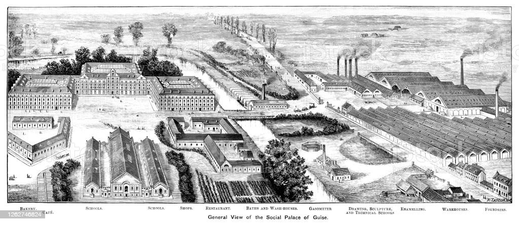 장-밥티스트 고댕(Jean-Baptiste Godin)은 양은 그릇으로 자수성가한 사업가였다. 양심적인 사업가였던 그는 공장이 커지자 노동자들의 기숙사를 지으려 했는데, 이로 인해 코뮨주의자들인 푸리에주의자들과 만나게 된다. 푸리에주의자가 된 고댕은 한쪽에는 생산하는 공장을, 다른 한쪽에는 노동가들이 생활하는 ‘궁전’ 같은 집을 짓는다. 그는 베르사이유 궁전의 형태와 유사한 모습의 집합주택을 만들고 ‘가족궁전’이란 뜻의 ‘파밀리스테르’라는 이름을 붙였다. 미음자 형으로 된 세 개의 집합주택이 있고, 그 가운데의 중정(中庭)에는 유리지붕을 덧붙여서 집회나 결혼식 등의 모임에 사용했다. 건물 뒤에는 아이들을 공동으로 키우는 탁아소가 있고, 건물 앞쪽에는 학교, 식당, 공작실, 무대가 있는 극장까지 포함된 공동 건물들이 있다. 노동자 주거문제가 매우 심각한 사회문제였던 유럽 전체에 이것이 준 영향력은 매우 컸다. 그때까지 노동자의 주거문제는 위생문제로서 공중 위생법의 대상으로 다루어졌는데, 이는 빈민굴을 전염병의 진원지로 보는 것을 뜻했고, 따라서 철거가 주된 해결방법이었다. 그러나 노동자가 함께 ‘철거’될 수 없는 한, 이는 노동자 주거문제를 더욱더 악화시킬 뿐이었다. 이런 상황에서 파밀리 스테르는 코뮨적인 조합의 형태로 집합적인 노동자 주거를 성공적으로 해결한 사례로 인정되었다. 고탱은 조합을 만들어 이 건물의 ‘소유권’을 조합원들에게 나누어 주었고, 그가 죽은 후에도 이들은 생산과 생활을 함께 하는 삶을 계속했다.