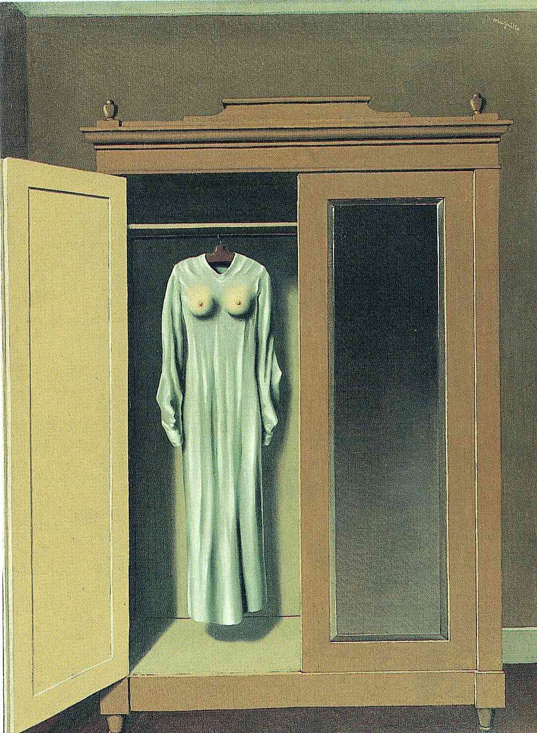 마그리트(René Magritt)의 그림 「세네트에게 바침」(Homage to Mack Sennett)이다. 프로이트의 이론을 가장 열광적으로, 그리고 가장 명시적으로 받아들인 사람들은 ‘초현실주의자’들이었다. 초현실주의(surrealism)란 현실을 넘나들려는 입장을 말하는 게 아니다. 대상의 겉에 드러난 것을 보는 ‘실재론’(reallism)과 달리, 그것을 보이지 않는 어떤 것의 ‘징후’ 내지 ‘증상’으로 보려는 태도를 초현실주의라 한다. 그들은 마치 정신분석가들이 그러하듯이, 모든 것에서 성욕의 징후를 보고, 모든 곳에서 성욕의 표상을 찾는다. 철학적 사유가 담긴 재치 있는 그림을 많이 그렸던 마그리트 또한 그들 중의 하나였다. 그는 이 그림에서 옷장에 걸린 옷에서도 그것이 가리고 있는 것을 본다. 혹은 옷장에서도 그것을 보고, 사람의 얼굴에서도 젖가슴과 음부를 보는 강력한 투시안을 가졌다. 그러나 사실 이런 투시안을 갖는 것은 그리 어렵지 않다. 자, 이제 눈을 지그시 감고 명상을 시작하라. 그리고 떠오르는 모든 대상을 남근이나 성욕의 대상, 그리고 엄마와 아버지에 연결시켜 보라. 가령 플러그는 남근이고, 콘센트는 질이고, 쭈쭈바는 남근이고 그것을 빨아먹는 것은 무엇을 의미하고 등등……. 눈이 친히 밝아진 게 느끼지지 않는가? 이것을 찾아내는 데 재능이 있다고 생각되면, 주지 말고 광고 기획사를 찾으면 좋다. 알다시피 TV 광고의 많은 부분이 지금은 이런 상징을 일부러 만들어내고 있으니까.