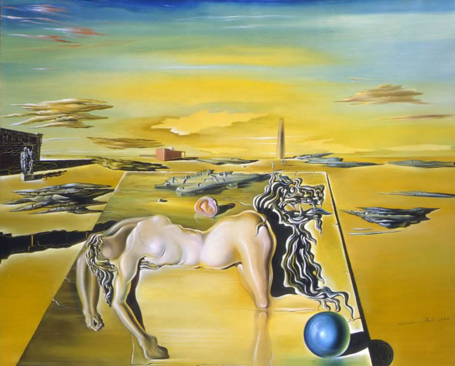 이 그림은 달리가 즐겨 사용했던 일종의 중의적 ‘응축’을 가장 단순한 형태로 보여준다. 오른쪽의 머리, 왼쪽의 꼬리를 보아 이 그림의 중심에 있는 것은 사자다. 그러나 왼쪽의 털은 유심히 보면 여인의 머리털이다. 그 옆엔 젖가슴도 있다. 이처럼 이는 사자와 여인이 섞인 그림이다. 우리는 꿈속에서 이런 형상을 종종 본다. A의 모자를 쓰고, B의 얼굴에 C의 머리 모양을 한 상(像), 이런 걸 프로이트는 ‘응축’이라고 불렀다. 여러 개의 이미지가 하나로 응축된 것이란 말이다. 이미지를 섞는 꿈의 작업 방식 중 또 하나 중요한 것은 ‘치환’이다. 예를 들어 성교가 계단을 오르는 장면이나 다쳐서 피를 흘리는 것으로 나타나는 것이 치환이다. 이 그림에선 여인이라는 욕망의 대상이 사자의 형상으로 치환되어 나타나고 있음을 보여준다. 이런 식으로 달리는 응축과 치환에 의해 여러 가지 이미지들이 중의적으로 복합되는 형상을 탁월하게 만들어냈다. 프로이트를 이보다 더 철저하게 써먹은 사람을 찾긴 힘들 것 같다.