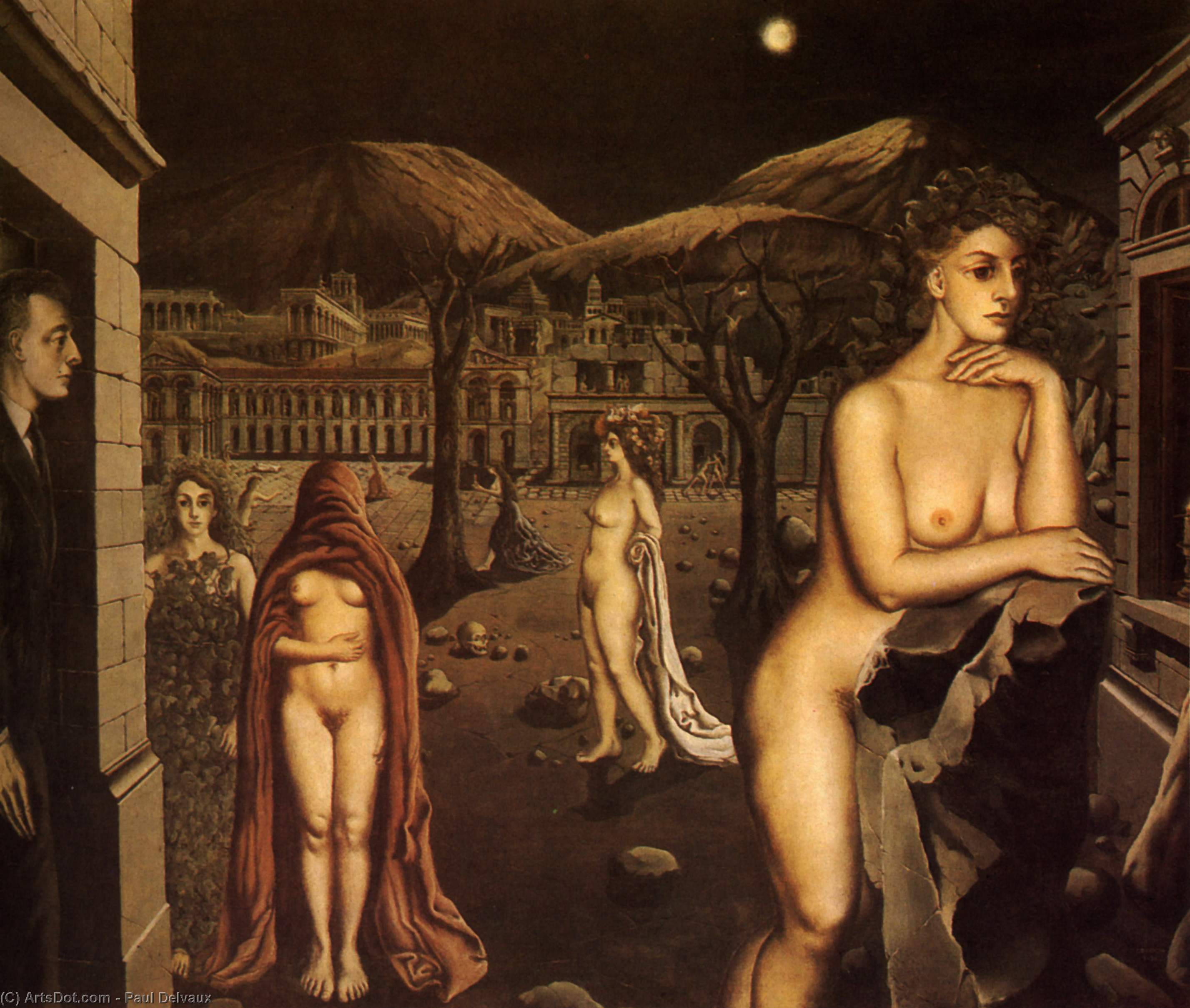 그래서 이런 대비는 종종 루소를 연상시키는 문명과 자연의 대립 같은 것으로 간주되기도 한 이는 실제로 프로이트가 『문명과 그 불만』에서 쓰고 있는 것과 무관하지 않다. 잠든 도시를 옷 벗은 욕망이 걷고 있다. 잠든 도시와 잠들지 않는 욕망의 대비를 보여주려는 것일까? 아니 잠들어 있을 때 비로소 욕망은 웃을 벗어던지고 스스로를 드러내는 거라고 해야 할까? 그처럼, 꿈일까? 어둠과 교교한 달빛, 그리고 어둠으로 물든 신체들, 하지만 여기서는 누구도 옷을 다 벗지 못하고 있다. 대부분 옷을 입고 등징하는 남자야 문명의 일부분이라고 하자. 여인들은 옷을 반쯤 걸친 사람과 나뭇잎으로 옷을 삼은 사람만이 있다. 잠든 도시 안에서도 어느새 문명을, 옷을 다 벗어버릴 수 없게 된 숙명을 그리려던 것이었을까?