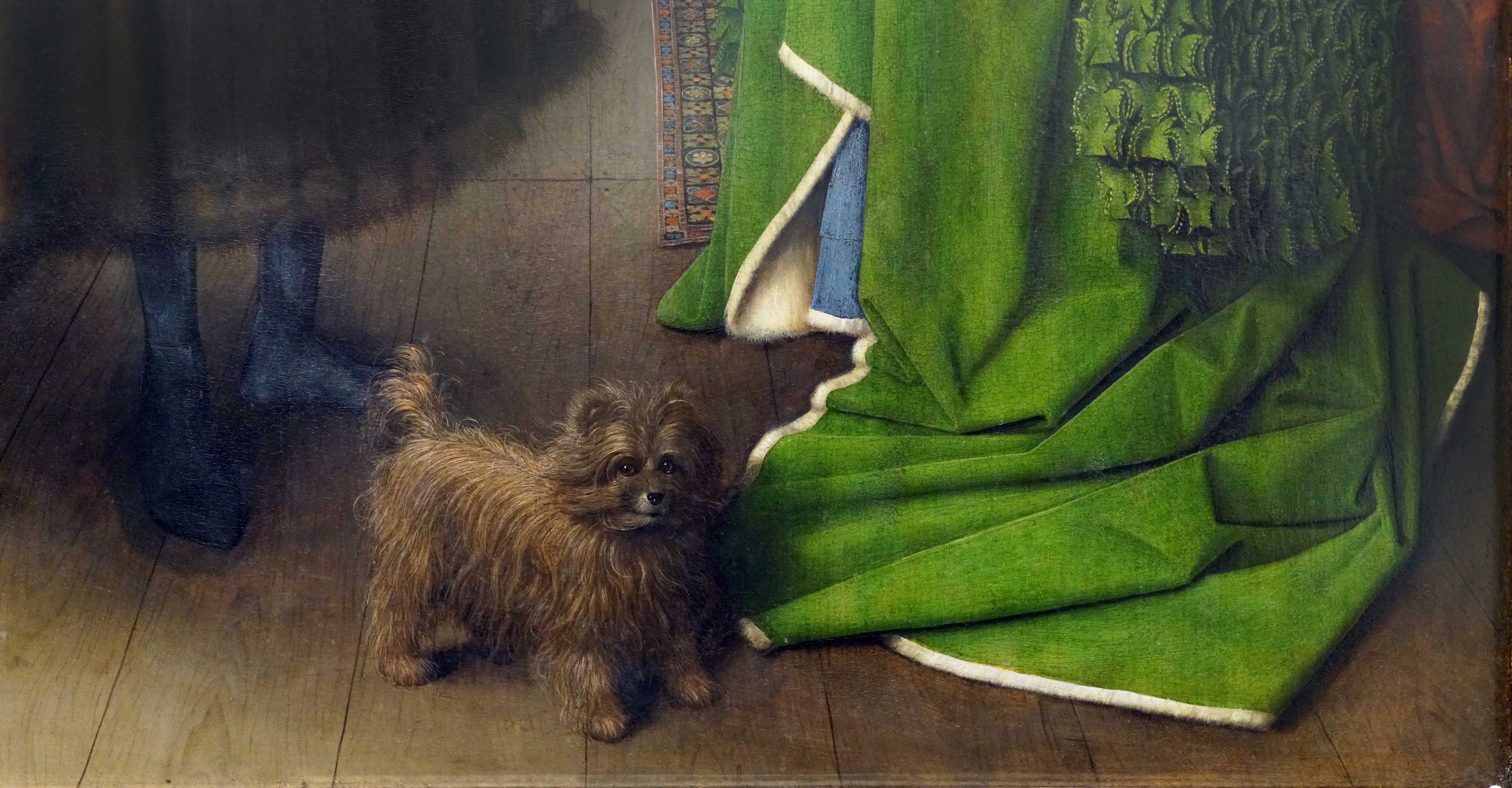 위 그림은 반 아이크(Jan van Eyck)의 「아르놀피니의 약혼」(The betrothal of Arnolfini)에 등장하는 강아지다. 기묘한 표정의 상인 아르놀피니와 이미 배가 남산만큼 부른 약혼자의 발 밑에서 얼쩡대는 중인 것을 끌어왔다.