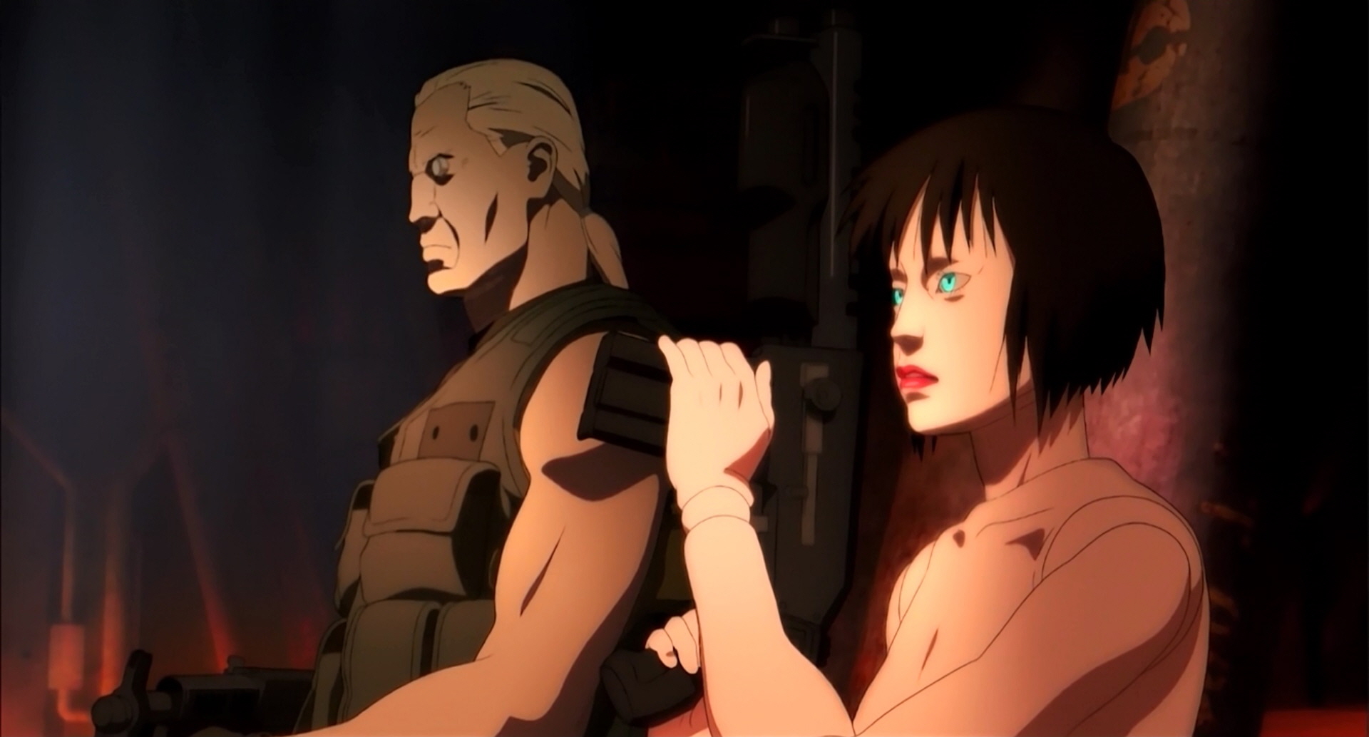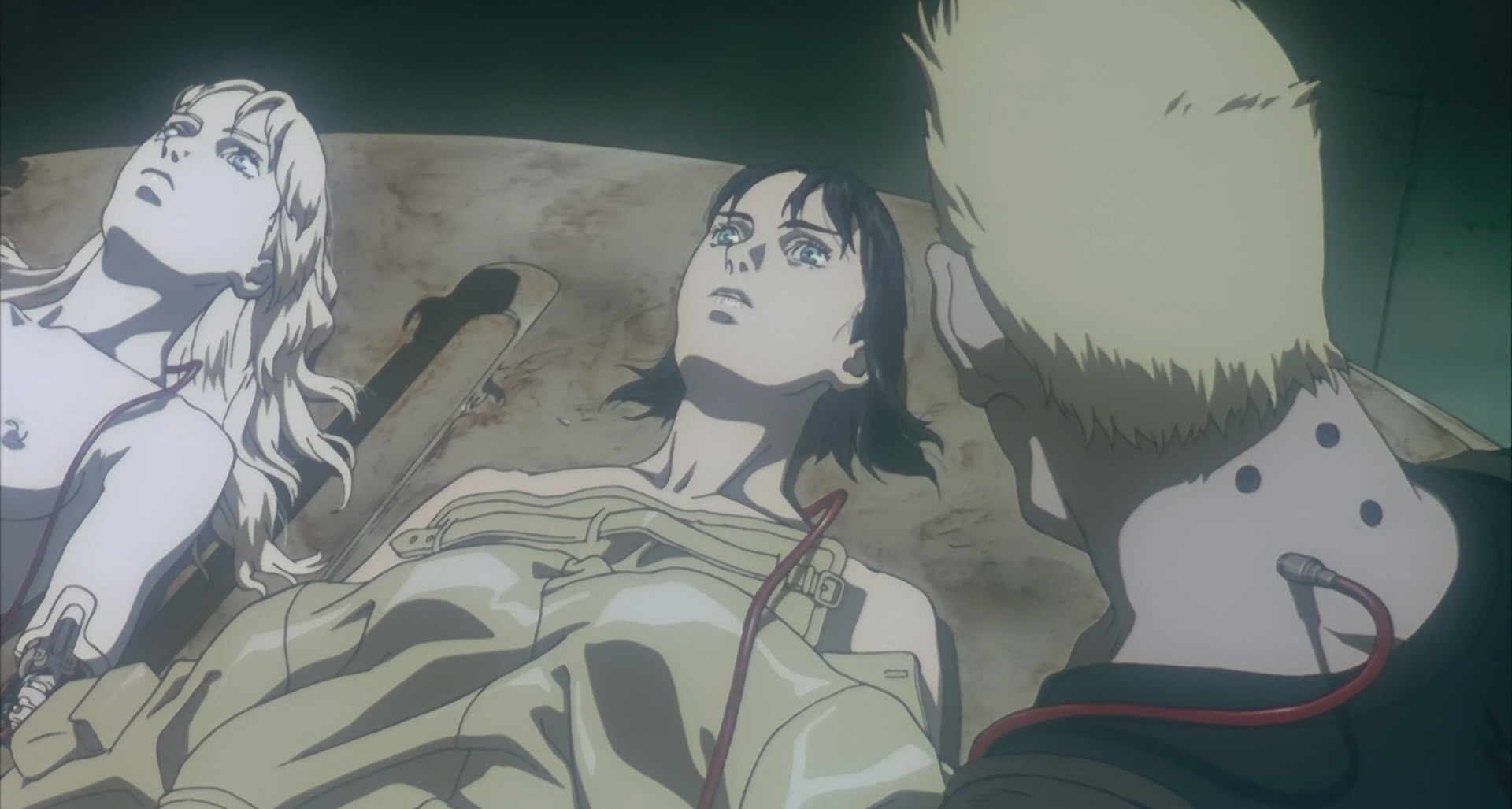 바토만이 아니라 인형사 역시 쿠사나기에게 매료된다. 하지만 뜻밖에 수줍은 바토에 비해 인형사는 구애에 적극적이다. 그는 망가진 몸으로 감히 말한다. 쿠사나기와 합체하고 싶어서 공안9과로 들어간 거라고, 그 두 개의 신체는 접속하여 섞이기 시작한다. 박테리아식 생식? 혹은 프로그램-생명체와 사이보그의 결혼식? 그 두 신체를 연결해준 바토는 자신이 좋아했던 여자의 주례를 서게 된 셈일까? 물론 그는 아직 사태를 정확하게 파악하지 못했다. 그래서 합체의 결과 탄생한 것(두 번째 사진)이 여전히 쿠사나기일 거라고 믿는다.