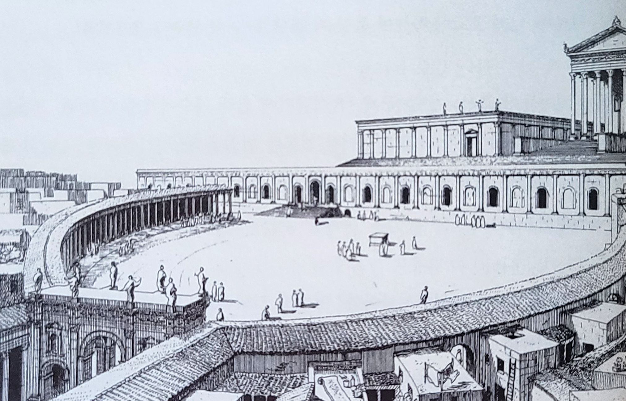 (위) 제라시의 원형광장(Oval Piazza)과 제우스신전의 복원그림
