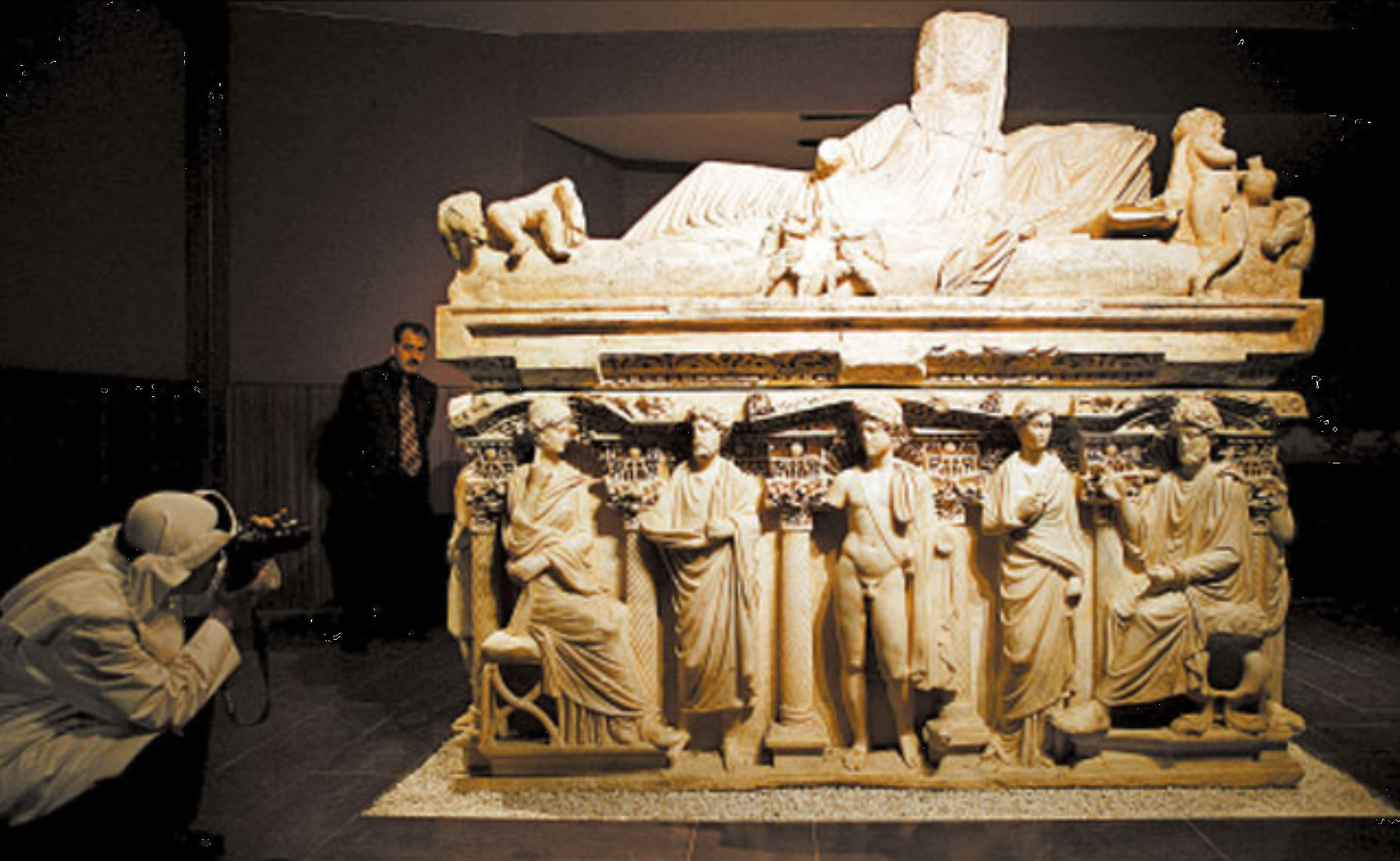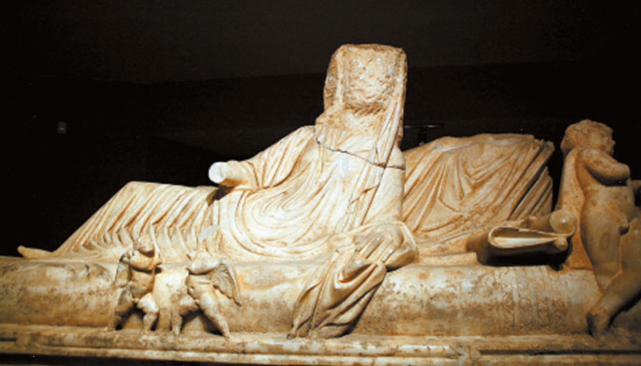 (위) 석관 전면 전경, 양쪽으로 남·여가 앉아있는데 석관의 주인공 부부일 것이다. 떨어져 있지만 손 모양을 보면 두 사람은 대화를 나누고 있다. 가운데 나신상은 아폴로, 이들의 지적 삶을 나타낸다.