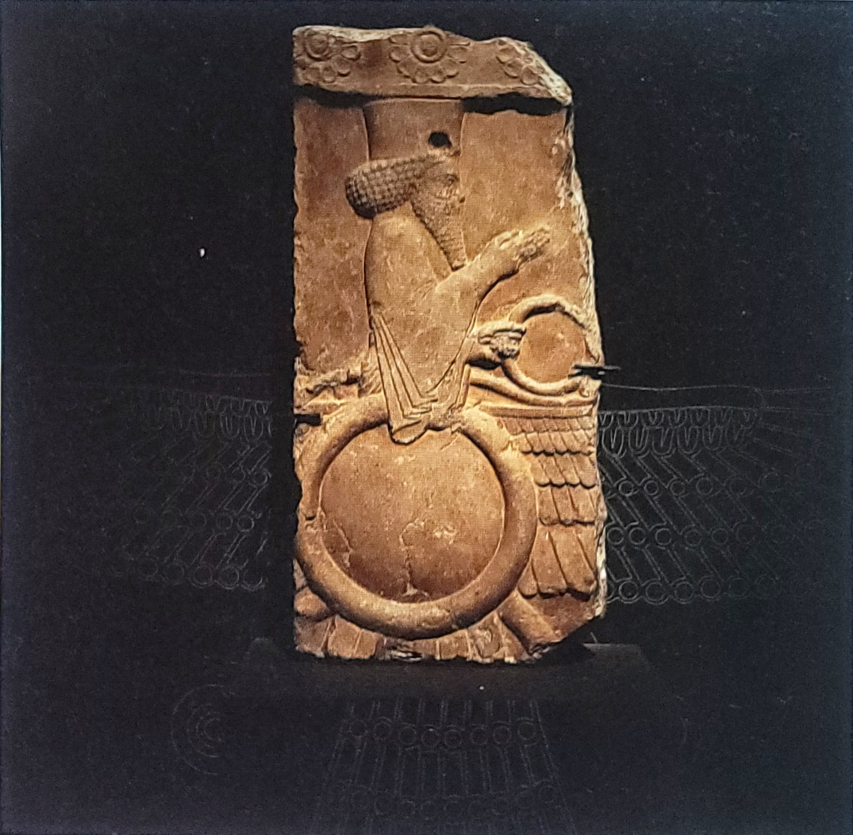 ▲ 우리나라 국립중앙박물관에 전시되었던 페르세폴리스의 부조 아후라 마즈다상, 상반신은 인간의 모습으로 손에는 원반을 쥐고 있으며, 허리 아래 양옆으로 날개가 펼쳐져 있다. 날개는 사유의 순결과 말과 행동을 상징한다(바른 생각, 바른 행동, 바른 말의 三正道). 아후라 마즈다를 최고신으로 섬기며 페르시아 종교를 개창한 조로아스터는 공자와 동시대이며, 바로 니체가 말하는 차라투스트라이다. 베들레헴의 마구간 아기 예수를 방문한 동방박사 3인도 조로아스터교의 3마기(magi)로 간주되고 있다.