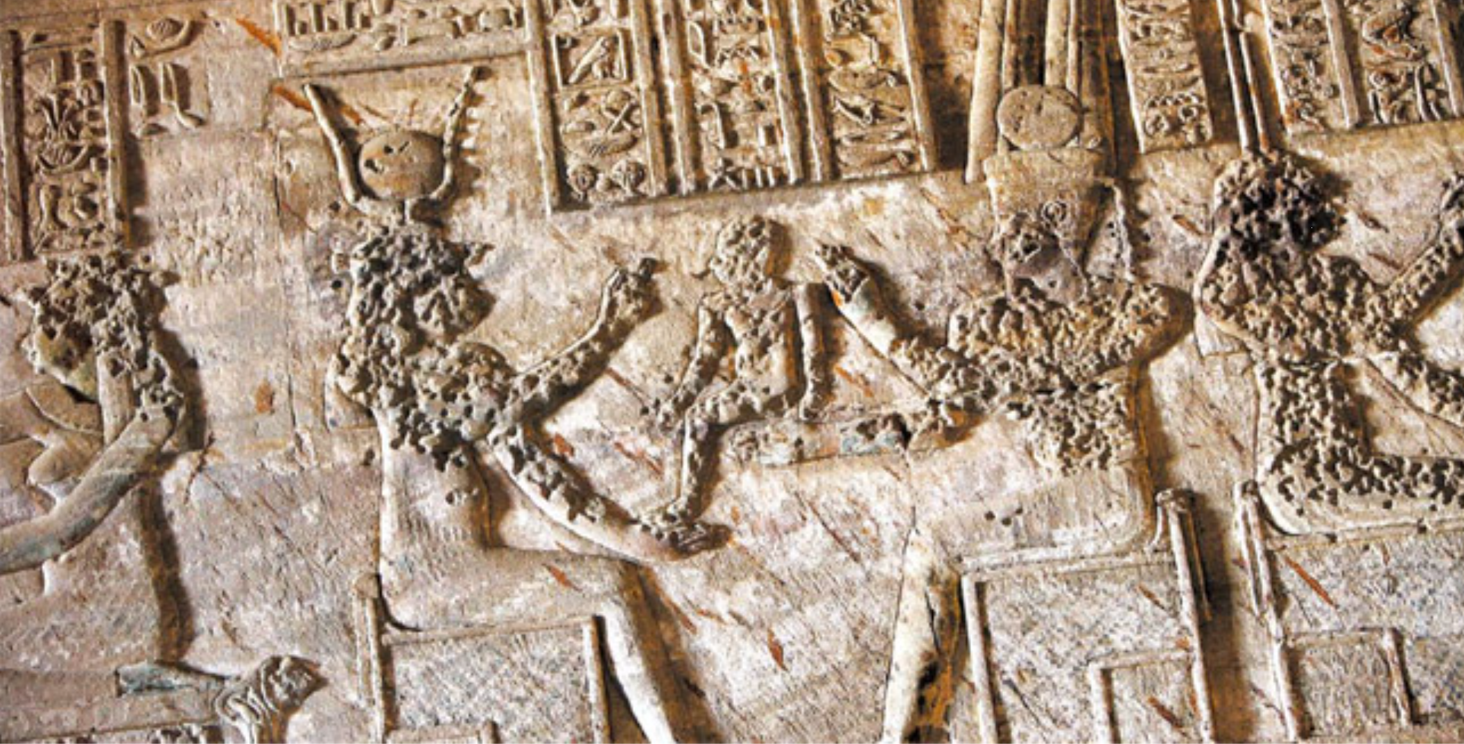 ▲ 이집트 테베지역 덴데라에 있는 하토르신전(Temple of Hathor)의 입구 오른쪽에 있는 탄생의 방(mammisi, birth house) 벽면에는 오시리스(오른쪽)와 이시스(왼쪽) 사이에서 태어난 아기 호러스(가운데)가 조각되어 있다. 그런데 이 모습은 아기예수 탄생설화와 겹쳐서 이해되었기 때문에 기독교인들은 이것을 용인할 수 없었다. 그래서 그 아름다운 조각을 모두 정(釘)으로 쪼아버렸다(5~6세기). 신앙이 이런 짓이나 열심히 하는 행위라고 한다면 한번 기독교신앙의 의미를 본질적으로 반추해볼 만하다.