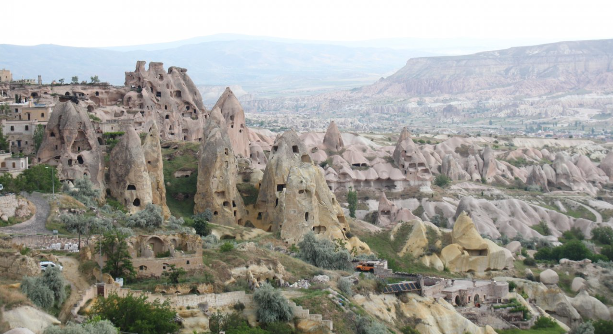 괴레메 옆동네 우찌사르(Uçhisar) 전경, 저 높은 바위속이 터널과 창문으로 뚫려있으며 괴레메지역에서 가장 높기 때문에 거기서 보면 사방장관의 파노라마가 펼쳐진다. 1980년대 이전만해도 아무도 찾지 않는, 태고의 정적이 감도는 촌락이었다. 성ㆍ속이 혼재하며 인간의 삶이 전승되어온 살아있는 마을이다.