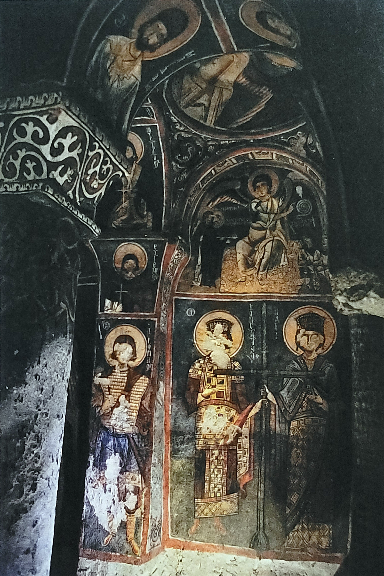 ▲ 안식후 첫날 새벽 예비한 향품을 가지고 예수 무덤을 찾아간 두 마리아(상단), 그 아래는 콘스탄티누스 대제와 최초의 성지 순례자인 그의 엄마 헬레나(하단), 우리나라 조선조 『삼강행실도』처럼 비주얼로 예수에 관한 이야기를 늘어놓는데 이런 벽화가 활용되었다. 어둠교회 벽화.