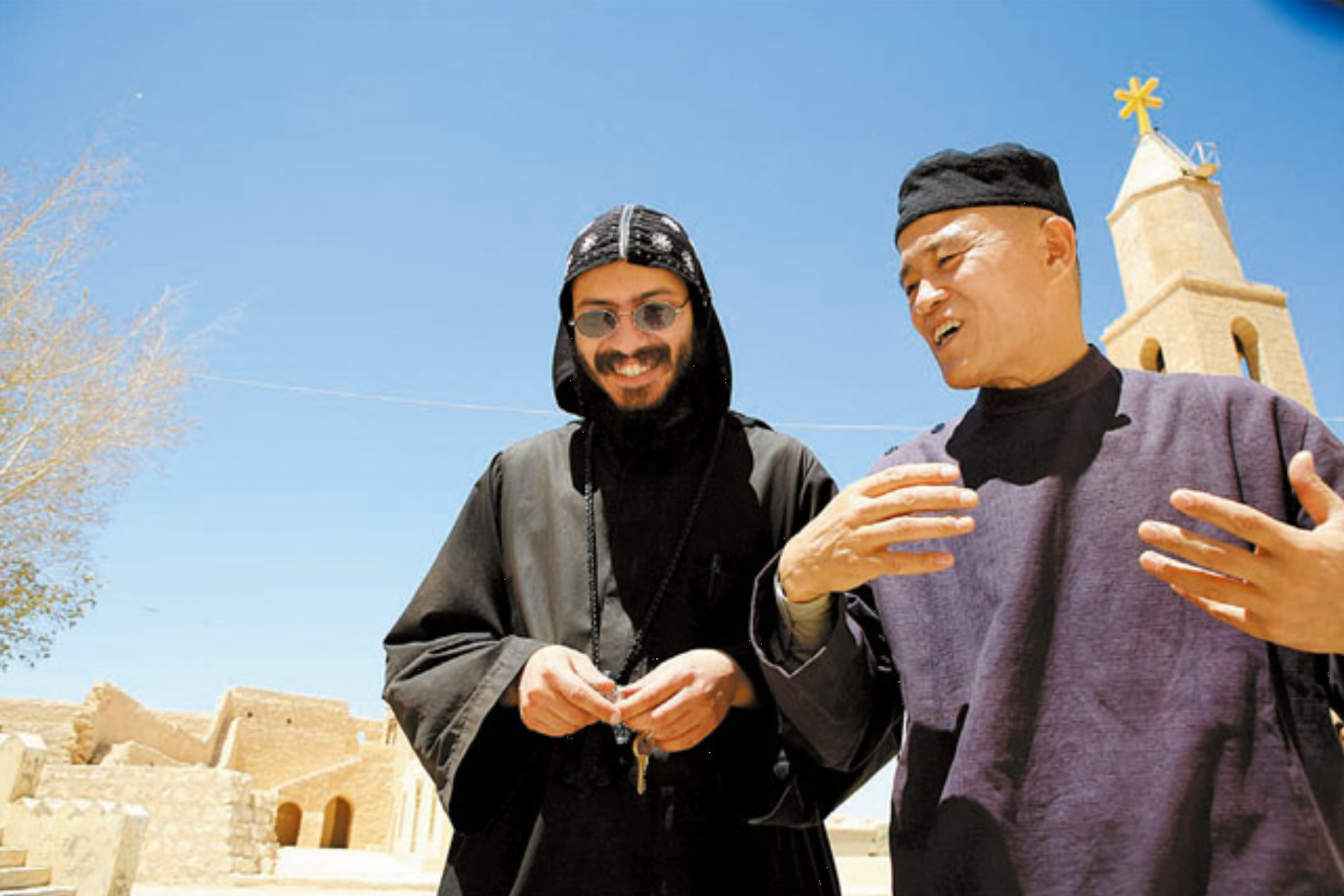 ▲ 안토니 수도원의 수사 루메우스와 담소하는 도올. 이들은 먹는 모든 것을 자급한다. 수사들이 만든 햄은 정말 맛있었다.