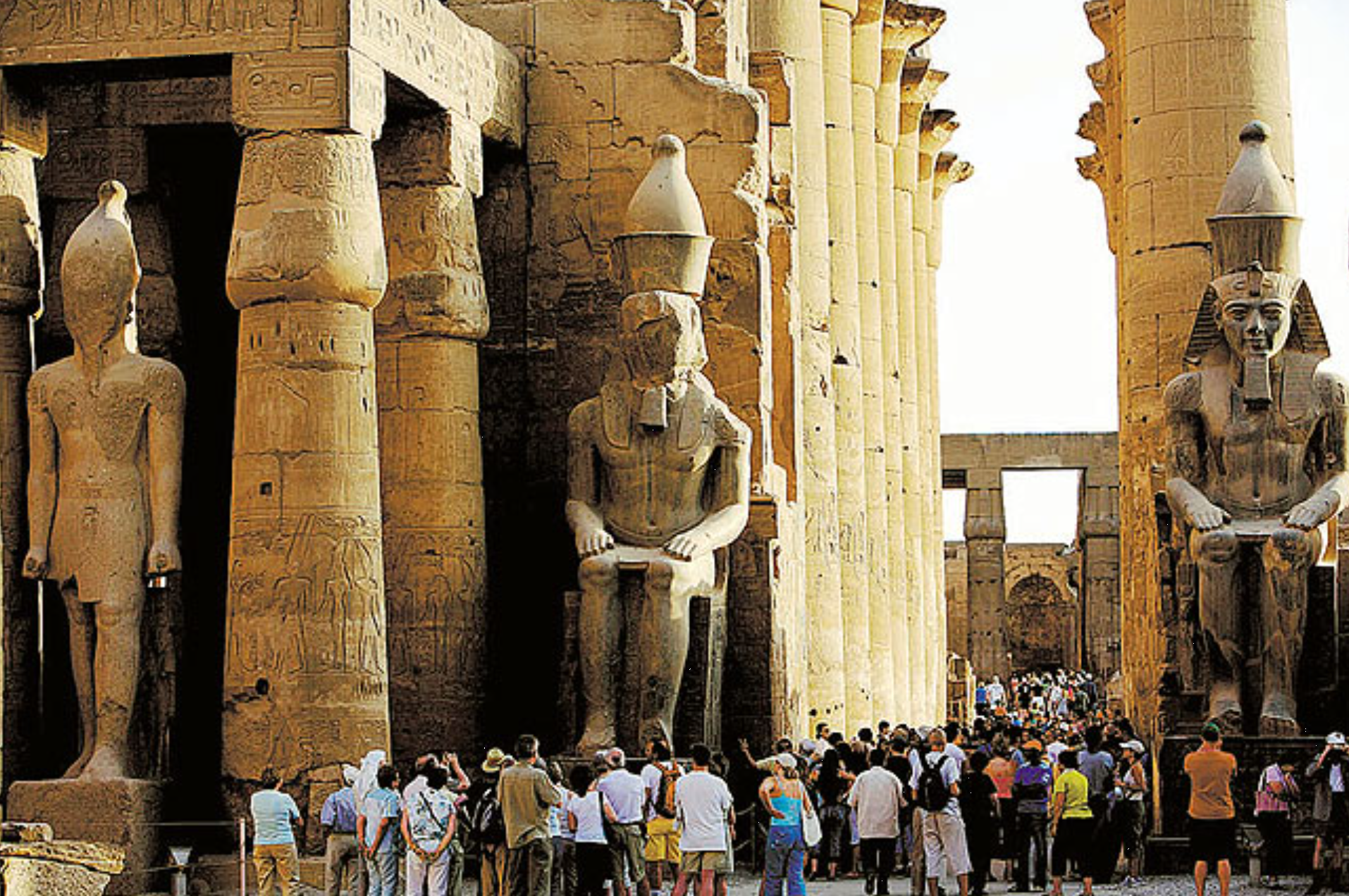▲ 신왕조의 파라오인 아멘호테프 3세(AmenhotepⅢ, BC 1387~1350 재위)에 의하여 그 원형이 완성된 룩소르 신전(Luxor Temple)은 이집트 테베지역의 대표적 신전이다. 나일강변에 위치하고 있는 이 신전은 석양에 보면 더 찬란하게 빛난다. 앞에 있는 거대한 석상은 람세스2세인데 모세와 동시대인으로 여겨지고 있다. 모세도 이곳에 왔을 것이다. 그 뒤로 양편 7개씩 14개의 석주가 있는데, 아멘호테프 3세의 손자인 투탕카멘 치세 때 정교하게 조각되었다. 이 거대한 신전을 지배하는 것도 물론 신화이다.