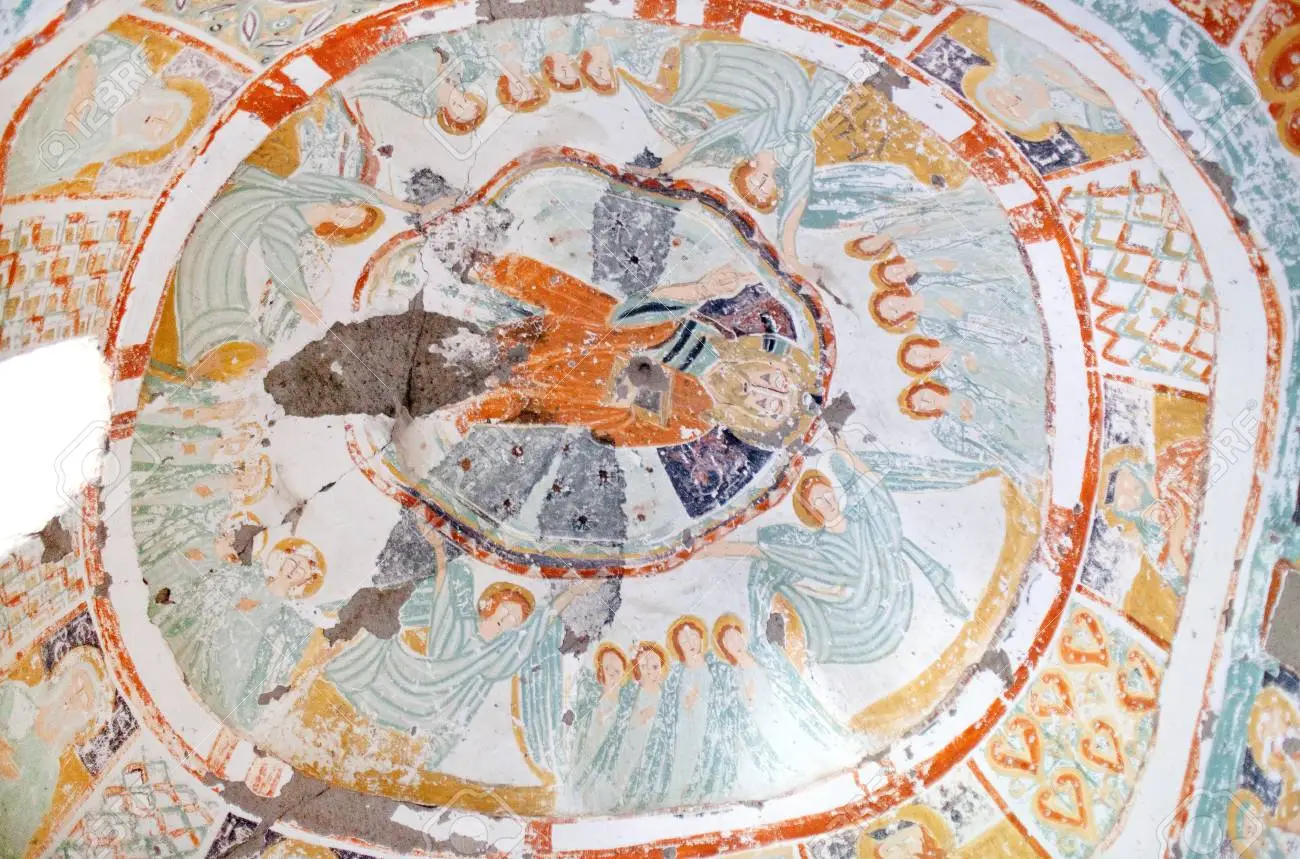 ▲ 으흐랄라계곡의 다니엘교회(The Church of St. Daniel, 일명 나무아래교회Beneath The Tree Church) 돔 벽화, 예수의 승천모습이 그려져 있는데 동방 페르시아 영향이 강하고 성상파괴 이전의 고벽화 모습을 전해주고 있다.