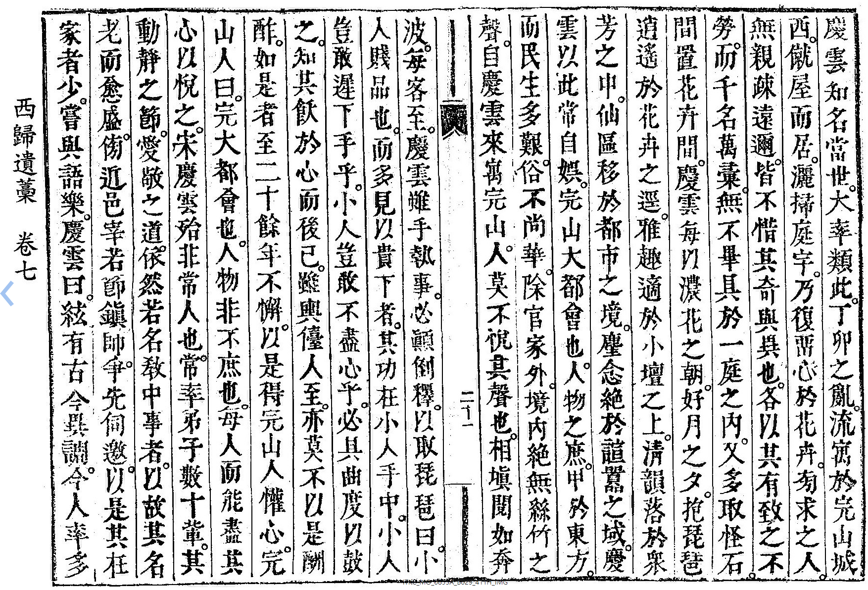 慶雲每以濃花之朝, 好月之夕, 抱琵琶逍遙於花卉之逕, 雅趣適於小壇之上, 淸韻落於衆芳之中, 仙區移於都市之境, 麈念絶於諠囂之域, 慶雲以此常自娛.