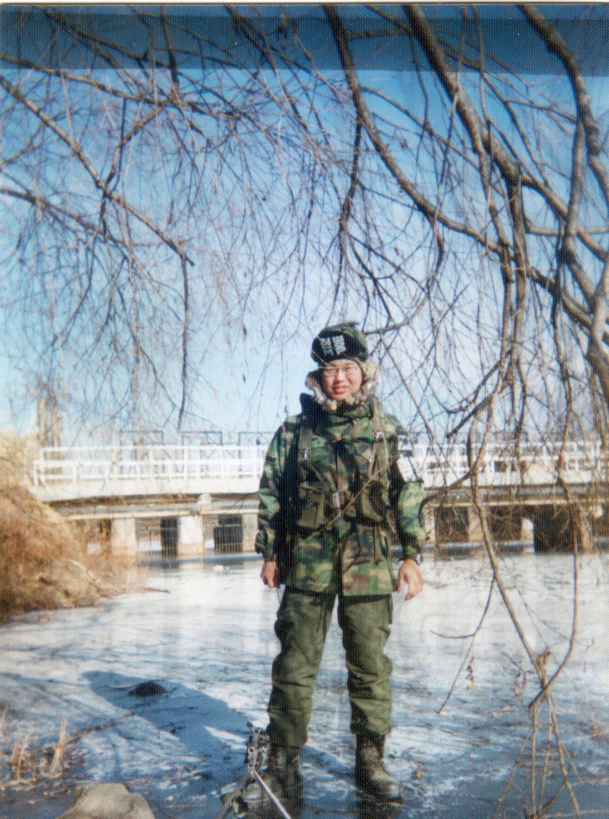 02년 1월에 찍은 사진. 일병 말호봉 때 얼어붙은 강물 위에 서서.