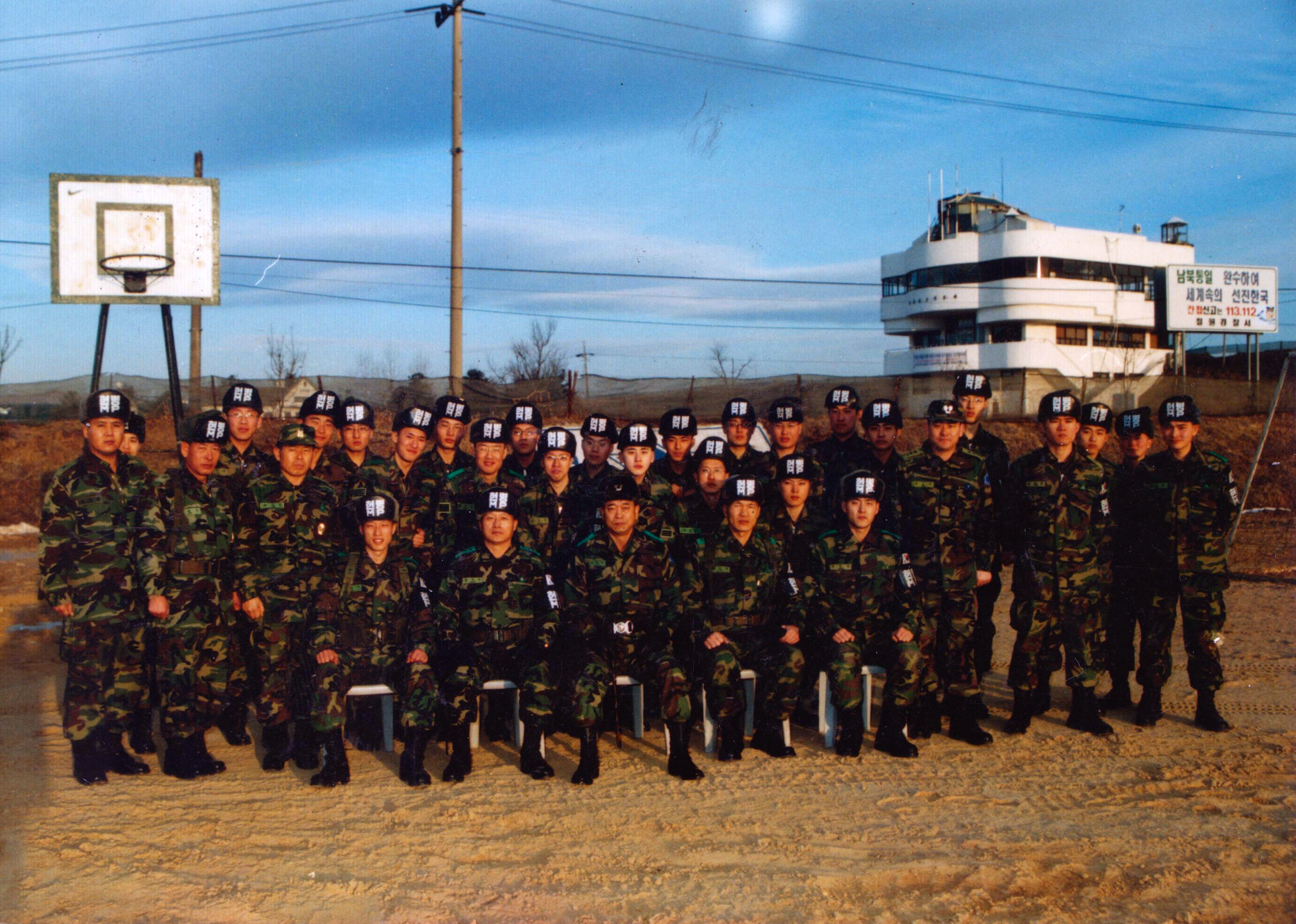그렇게 어둡고 지치며 불편했던 며칠간의 힘든 시간을 지나 설 당일을 맞이했다. 일개복으로 말끔히 차려 입은 우리는 대기막사에서 3007-1호가 올 때까지 대기하고 있었다. 드디어 주임원사님의 왔다는 소리와 함께 밖에서 “필승”이란 경례 소리가 천지를 울리듯 큼지막하게 들려왔다. 드디어 그토록 뵙고 싶었던 사단장이 오신 것이다. 사실 사단장님을 뵙고 싶단 표현보단 별 두 개를 단 계급장이 어떤지 보고 싶다고 표현하는 맞겠다. 수행인원 여럿과 함께 문을 열고 들어선 사단장님은 “새해 복 많이 받아라”라는 말씀과 함께 자리에 앉았고 우리들도 박수로 맞이한 채 자리에 앉았다. 그렇게 덕담과 덕담이 오고 가는 가운데 굴이 들어 있는 최고급 떡국을 10분 만에 뚝딱 먹어 치웠다. 며칠간의 그런 노력과 힘듦이 한 시간 만에 마무리되니 속이 다 시원하더라. 그렇게 끝나고 나서 밖에서 사단장님과 함께 전망대를 배경으로 당당한 모습을 카메라의 필름에 담았다.