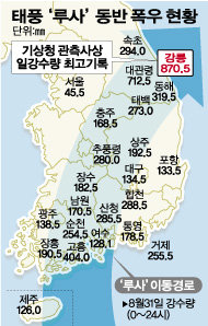 ‘루사’라는 15호 대풍이 한반도 전역을 휩쓸었다. 그래서 오늘 아침부터 비가 서서히 내리며 바람이 마구 불어대기 시작했다. 그냥 조금씩 올 거라 생각해서 별 신경 쓰지 않았는데 오후가 되어서 뉴스를 보게 되니 이미 전역이 태풍의 피해권에 있으며, 앞으로 많은 피해가 있을 거란다. 많이 온 곳은 이미 350mm의 강우량을 넘어선 데도 있었다.