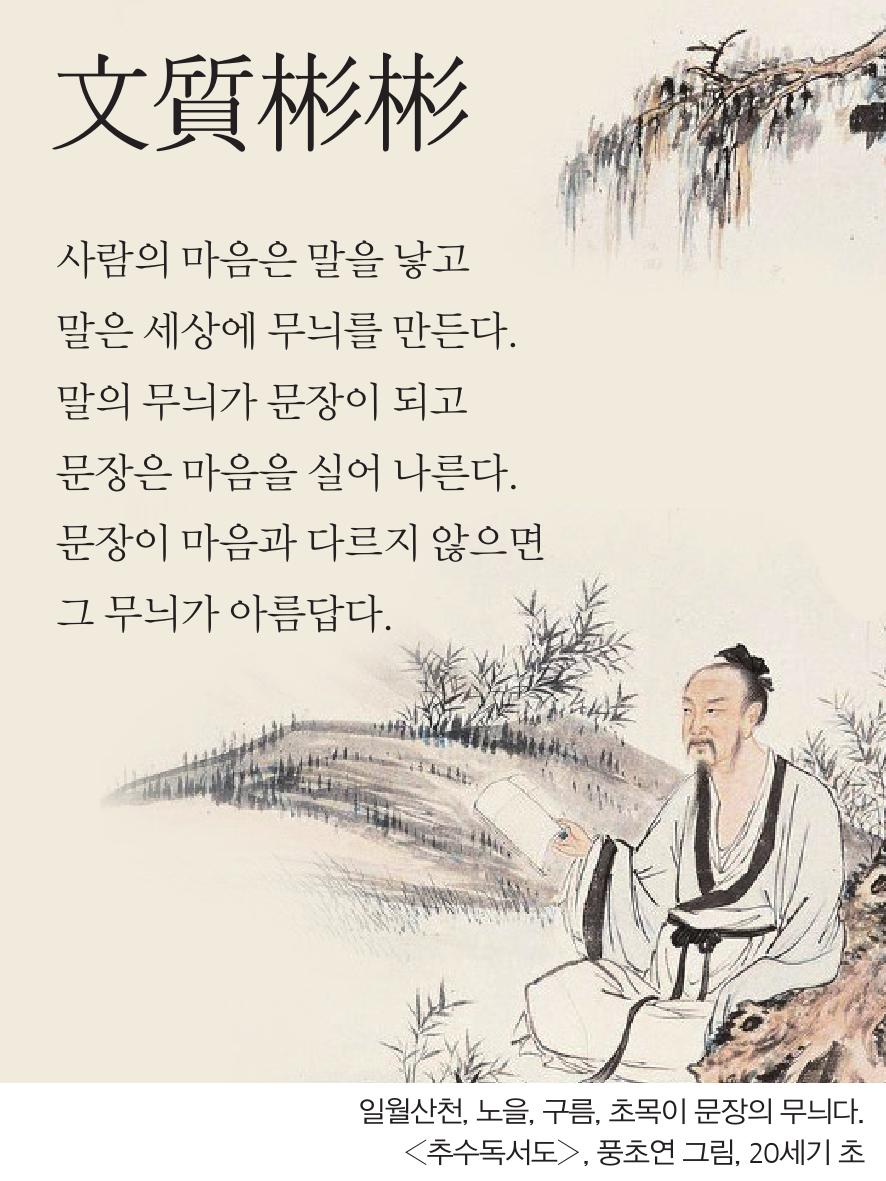 공자께서 “질(質)이 문(文)을 이기면 촌스러워 보이고, 문(文)이 질(質)을 이기면 그럴듯해 보이니, 문(文)과 질(質)이 조화를 이룬 후에야 군자라 한다.”고 말씀하셨다.