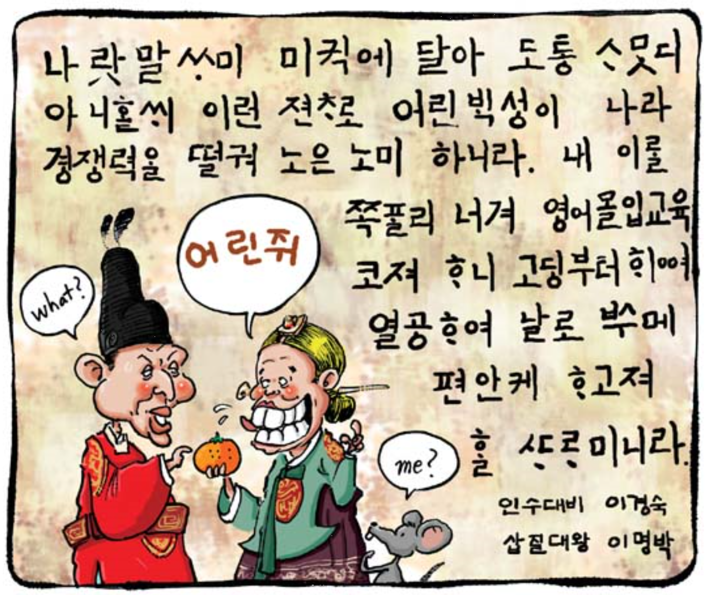 『소화시평』 권상 90번을 보면 문화사대주의에 쪄들었다고 핀잔을 줄 지도 모르지만, 그 당시엔 상식과도 같은 말이었다. 하긴 지금이라 해서 무작정 ‘한글전용’을 좋아하는 건 아니다. 어느 곳이든 지나가다 보면 영어로 된 간판이나, 영어를 한글로 표기한 간판을 어렵지 않게 볼 수 있으며, 길거리에 지나다니는 수많은 차들의 이름은 한글이 아닌 영어로 지어지고 버젓이 써 있으니 말이다. 그 당시엔 한문이 국제사회의 언어로 맹위를 떨쳤다면 지금은 영어가 그 지위를 이어받은 모양새고, 이 글에서 나오는 것 같은 논조들이 지금도 영어로 대체되어 횡행하고 있다. 오죽했으면 이명박 정권 당시엔 영어공용화 논쟁까지 불붙으며 어륀지 파문까지 일었겠는가. 그건 단순히 파문 문제로 끝난 게 아니라 대학가 강의까지도 전공에 상관없이 영어로 진행되는 지경에 이르렀다.