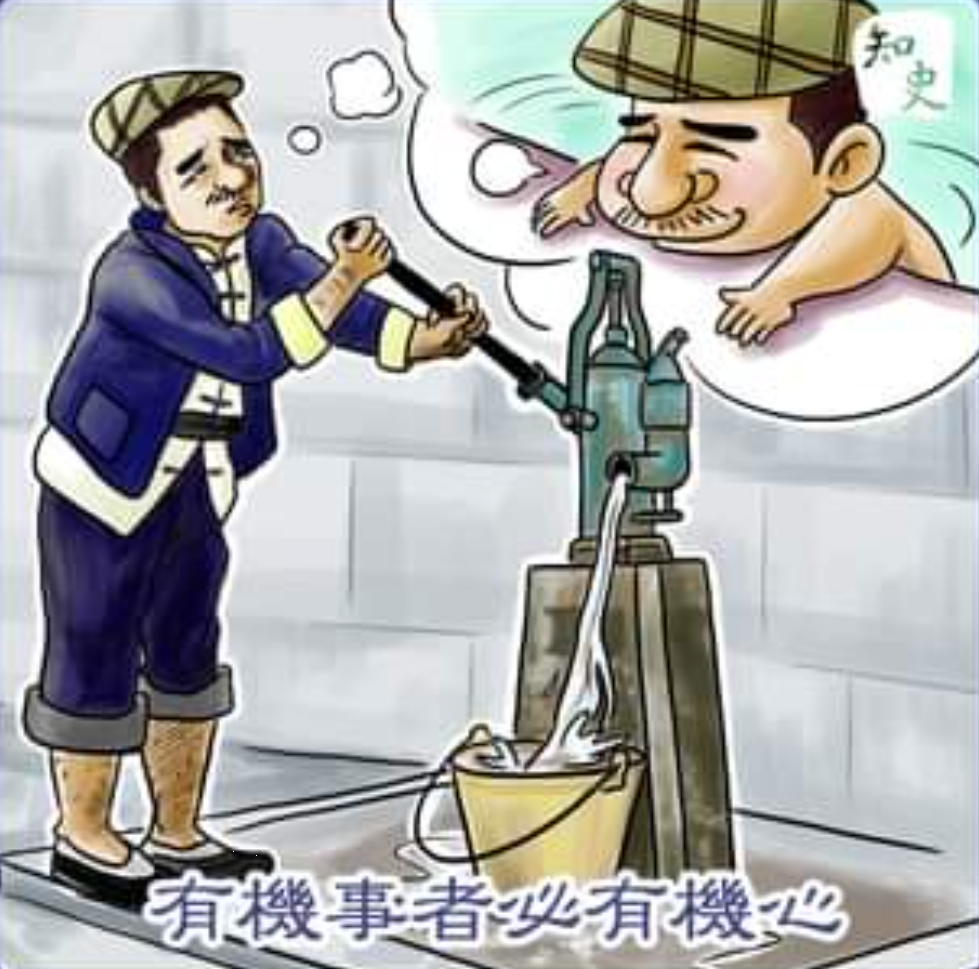子貢南游於楚, 反於晉, 過漢陰, 見一丈人方將爲圃畦, 鑿隧而入井, 抱甕而出灌, 搰搰然用力甚多而見功寡. 子貢曰: “有械於此, 一日浸百畦, 用力甚寡而見功多, 夫子不欲乎?” 爲圃者仰而視之曰: “奈何?” 曰: “鑿木爲機, 後重前輕, 挈水若抽, 數如泆湯, 其名爲槹.” 爲圃者忿然作色而笑曰: “吾聞之吾師, 有機械者必有機事, 有機事者必有機心. 機心存於胸中則純白不備. 純白不備則神生不定, 神生不定者, 道之所不載也. 吾非不知, 羞而不爲也.” 子貢瞞然慚, 俯而不對. 有間, 爲圃者曰: “子奚爲者耶? 曰: “孔丘之徒也.” 爲圃者曰: “子非夫博學以擬聖, 於於以蓋衆, 獨弦哀歌以賣名聲於天下者乎? 汝方將忘汝神氣, 墮汝形骸, 而庶幾乎! 而身之不能治, 而何暇治天下乎! 子往矣, 無乏吾事.” 子貢卑陬失色, 頊頊然不自得, 行三十里而後愈. 其弟子曰: “向之人何爲者耶? 夫子何故見之變容失色, 終日不自反耶?” 曰: “始吾以爲天下一人耳, 不知復有夫人也. 吾聞之夫子: 事求可, 功求成, 用力少, 見功多者, 聖人之道. 今徒不然. 執道者德全, 德全者形全, 形全者神全. 神全者, 聖人之道也. 托生與民幷行而不知其所之, 汒乎淳備哉! 功利機巧必忘夫人之心. 若夫人者, 非其志不之, 非其心不爲. 雖以天下譽之, 得其所謂, 謷然不顧; 以天下非之, 失其所謂, 儻然不受. 天下之非譽無益損焉, 是謂全德之人哉! 我之謂風波之民.” 反於魯, 以告孔子. 孔子曰: “彼假修渾沌氏之術者也. 識其一, 不識其二; 治其內而不治其外. 夫明白入素, 無爲復朴, 體性抱神, 以游世俗之間者, 汝將固驚耶? 且渾沌氏之術, 予與汝何足以識之哉!”