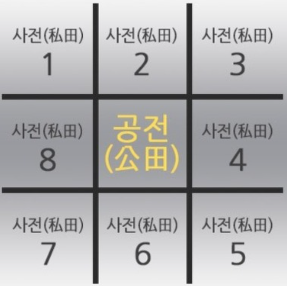 도시에선 조법(助法)을 써서 여덟 가구가 정전(井田)을 공유했다.