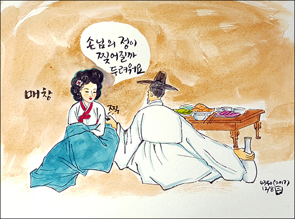 취한 손님이 명주로 된 저고리를 잡으니, 몸을 돌려 피하려다 명주저고리가 손님의 손에 찢어졌다. 비싼 명주저고리지만 아까울 것이 없다. 다만 손님께서 보내 주신 은혜의 정이 이 일 때문에 깨질 것이 두렵다.