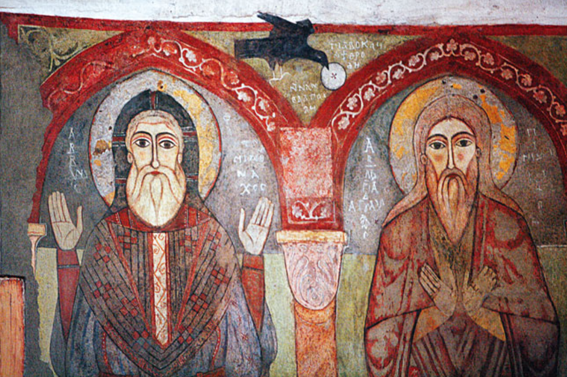▲ 제51편 사진 설명에서 인류 최초의 기독교 수행승 폴의 이야기를 했지만, 폴은 항상 안토니(Anthony, 251~356)와 같이 언급된다. 폴은 안토니보다 약 20세 연상이다. 안토니 생애에 관해서는 아타나시우스가 전기를 썼다. 폴과 안토니는 같은 시기에 아라비아사막에서 고독한 수행을 하고 있었지만 서로를 알지 못했다. AD 343년 어느 날 안토니는 이미 90년 이상을 한 동굴에서 수행하던 폴의 비젼을 보고 그를 찾아가게 된다. 두 사람이 만나 이야기를 나누고 있는데 까마귀가 빵 하나 전체를 물어다 놓았다. 폴은 말했다: “지난 60년 동안 하루도 안 빼놓고 까마귀가 빵 반 쪽을 가져다 놓았죠. 오늘은 당신이 오셨다고 주님께서 주님의 사도 두 사람 분량의 양식을 보내셨군요.” 온전한 빵 한 개를 까마귀가 물고오는 이 장면은 콥틱기독교 성화의 가장 유명한 테마이다. 초기기독교에 관해 많은 것을 이야기해준다. 왼쪽이 안토니, 오른쪽이 폴이다. 안토니수도원 안토니지성소의 벽에 그려져 있다.