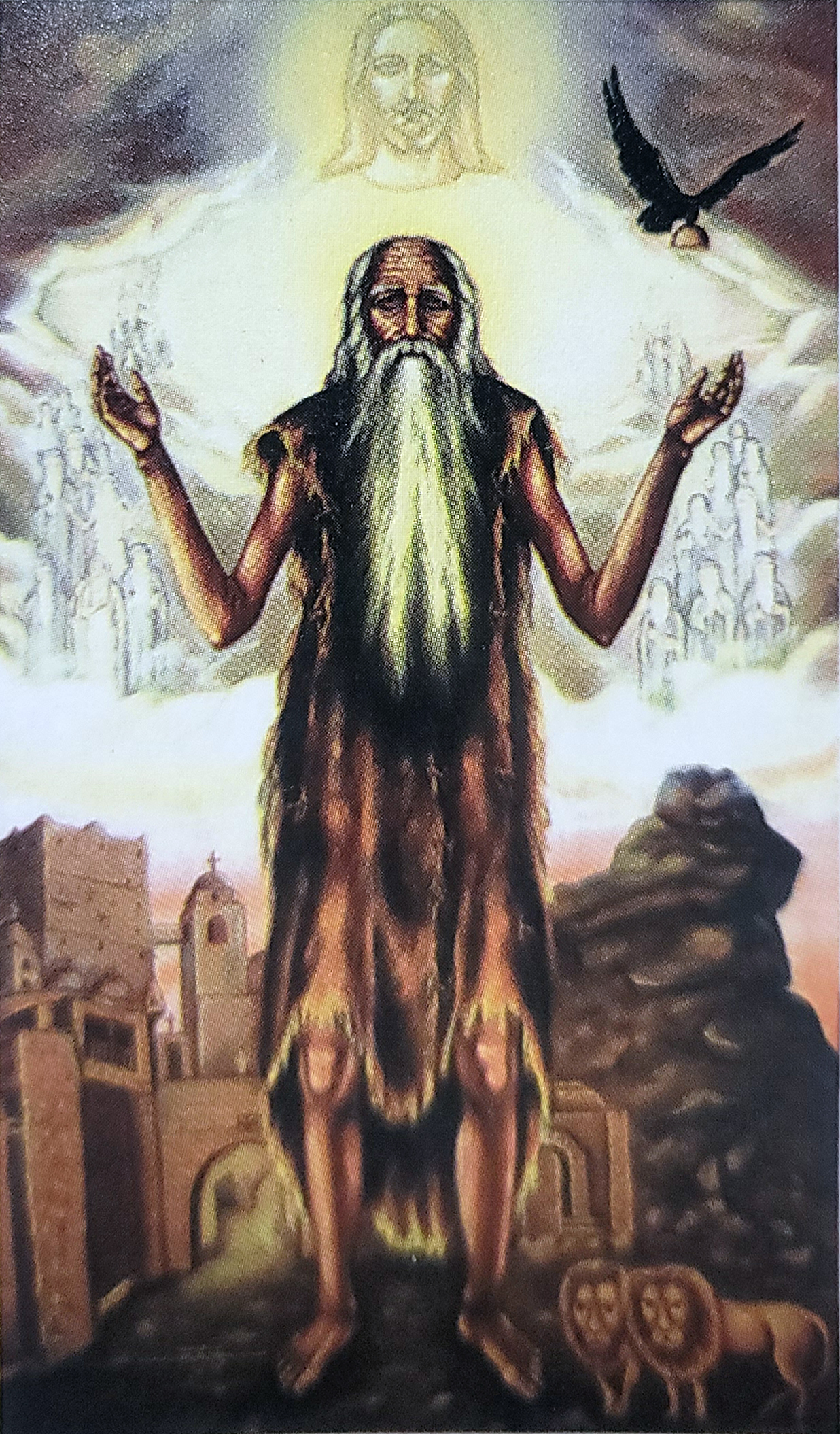 ▲ 인류 최초의 기독교 수행자 폴. 빵 반쪽을 물고 오는 까마귀와 무덤을 판 사자 두마리가 인상적이다.
