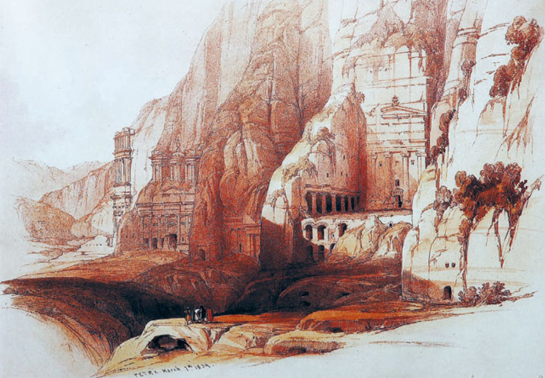 ▲ 버크하르트의 충격이 보고되자 그 뒤를 이어 간 사람이 바로 유명한 화가이기도 했던 영국인 데이비드 로버트(David Roberts)였다. 1839년 3월 6일 그는 페트라에 도착했다. 이 그림은 다음날 그린 것인데 페트라의 왕들의 묘역을 리얼하게 묘사하고 있다. 로버트의 그림들이 석판으로 출판되자 그것은 모험심에 가득 찬 유럽인들의 환상을 불러일으켰다.