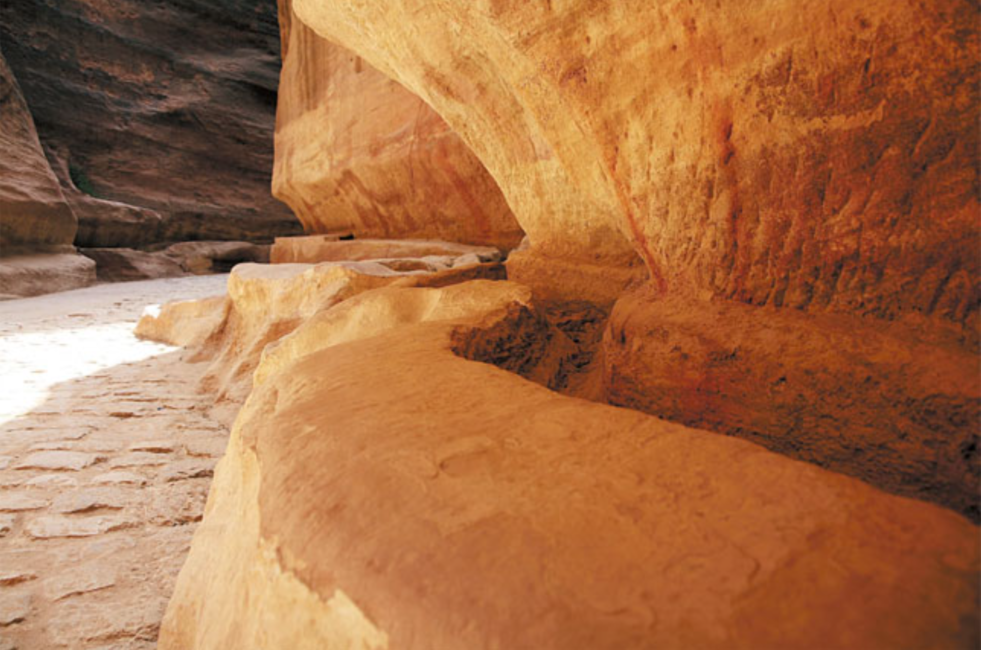 ▲ 민수기 20장에 보면 모세가 반석을 쳐서 물을 나오게 하는 장면이 있다. 그 생명수가 콸콸 쏟아지는 바위가 바로 이 근처에 지금도 있다(Ain Musa, 모세의 샘). 그 물이 옛날에는 이 협곡을 가득 메우고 흘렀다. 그래서 나바태안왕국의 사람들이 댐을 막고 물길을 돌려 이 협곡지역을 거주지로 만들었다. 대신 절벽을 파 수로를 만들어 식수를 공급하였다. 나바태안왕국 문명의 높은 수준을 말해준다.