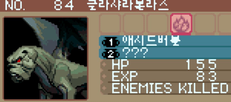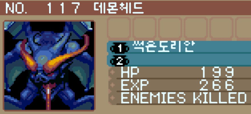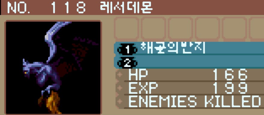 입수: 암두사아스(몬스터도감 129번)에게 입수. 암두시아스는 악마의 소굴의 (0, –13)에서 출현하는데 사우전드 엣지로 처지 가능. ‘아이템이 나오지 않음→게임중단하면 자동 중간 세이브됨→타이틀에 나와 중간세이브 데이터로 다시 시작→격파→토울링 나올 때까지 위 상황을 반복’하여 처지하면 됨.