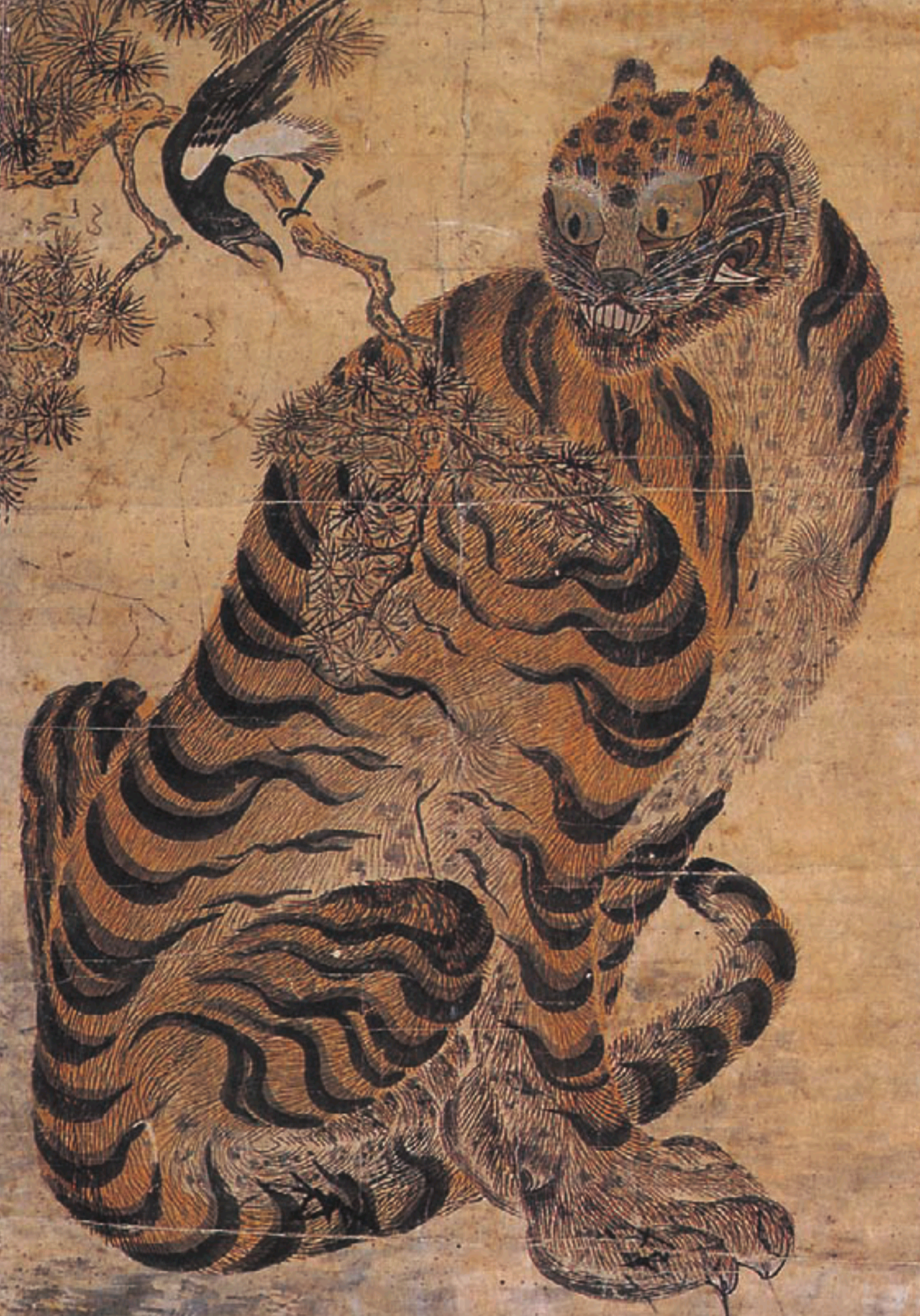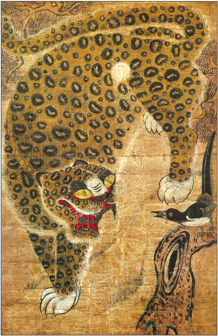 머리는 표범이고 몸은 호랑이다. 소나무 가지에 앉은 까치와 서로 기세 싸움이 한창이다.