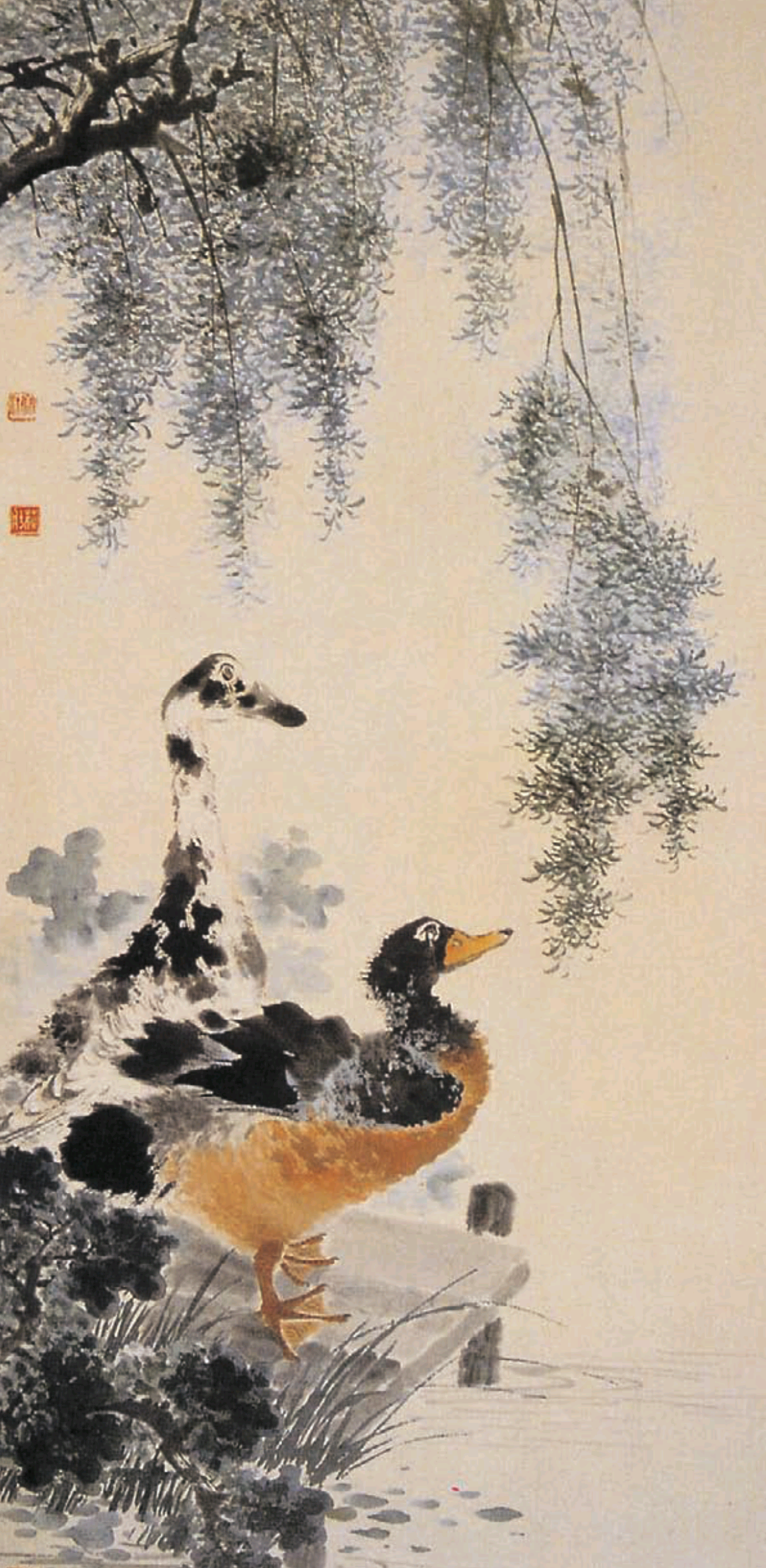 ▲ 강한정(江寒汀), 「춘류쌍압도(春柳雙鴨圖)」, 20세기, 135X65cm, 중국 상해미술관.