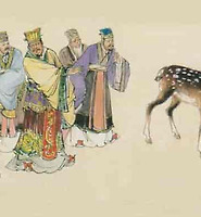 郎中令與樂俱入, 射上幄坐幃. 二世怒, 召左右, 左右皆惶擾不鬪. 旁有宦者一人, 侍不敢去. 二世入內, 謂曰: “公何不蚤告我? 乃至於此!”